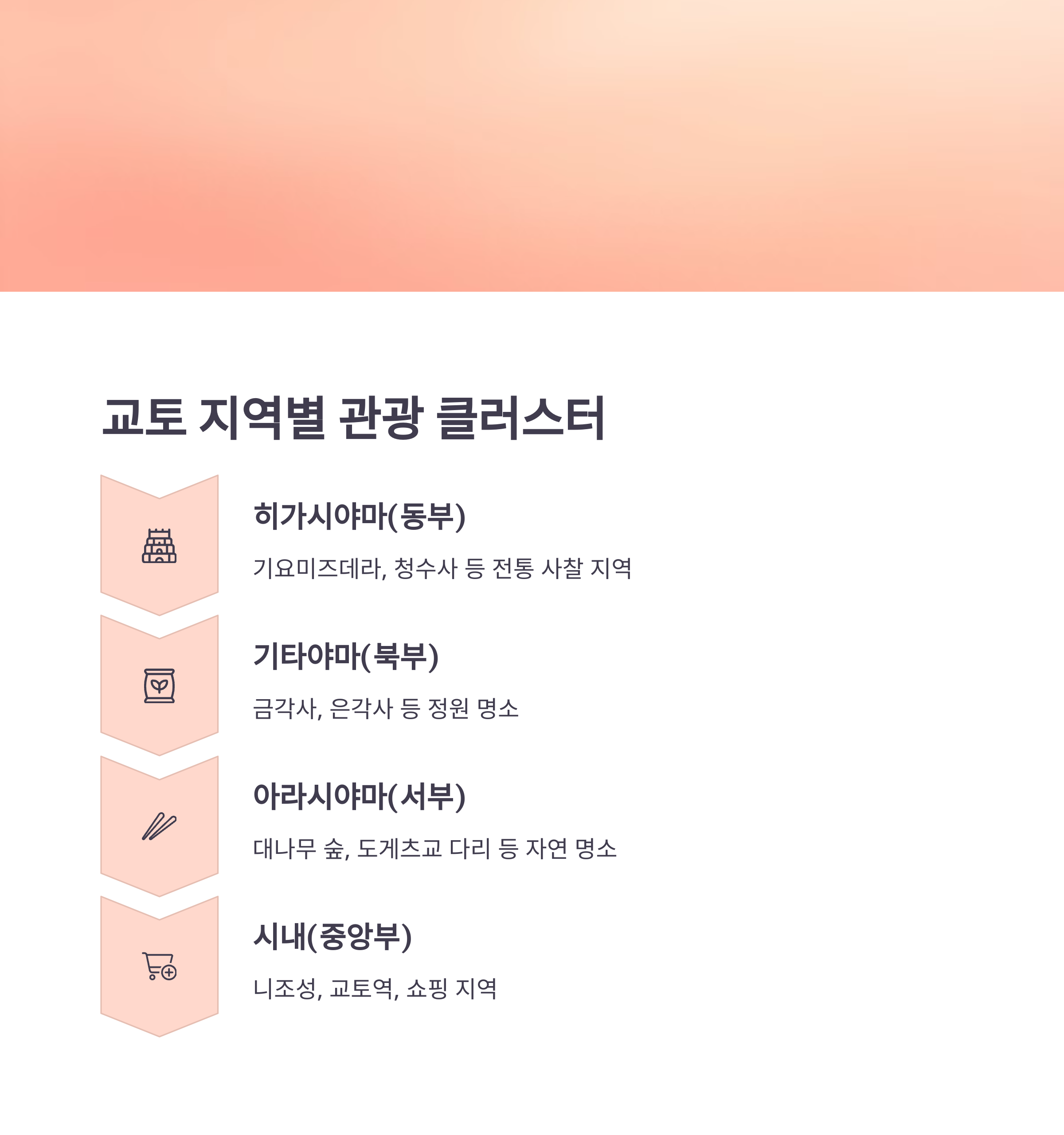 교토는 넓은 지역에 관광지가 분산되어 있어 지역별 방문 계획이 매우 중요합니다. 크게 동부(히가시야마), 북부(기타야마), 서부(아라시야마), 중앙부(시내)로 나눌 수 있습니다.