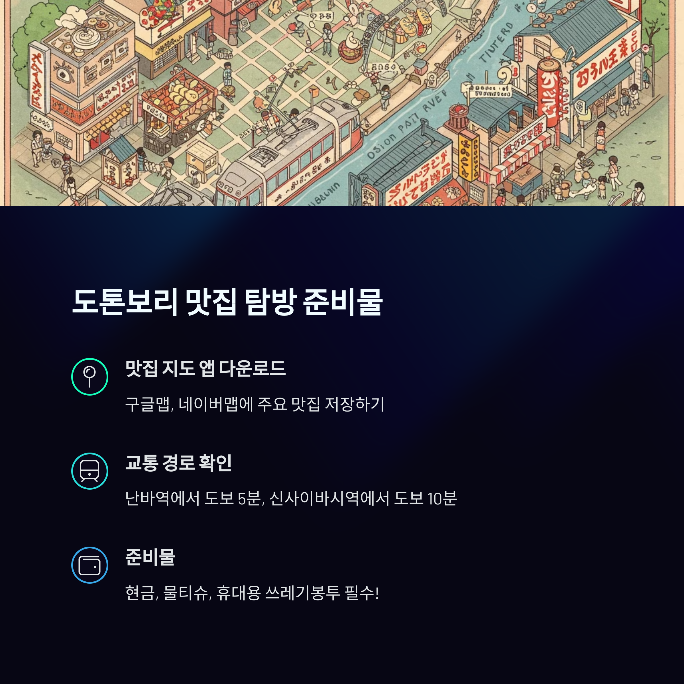 이 지도를 따라가면 오사카 여행의 하이라이트를 경험하실 수 있을 거예요! 자, 그럼 도톤보리 맛집 지도를 함께 살펴볼까요?