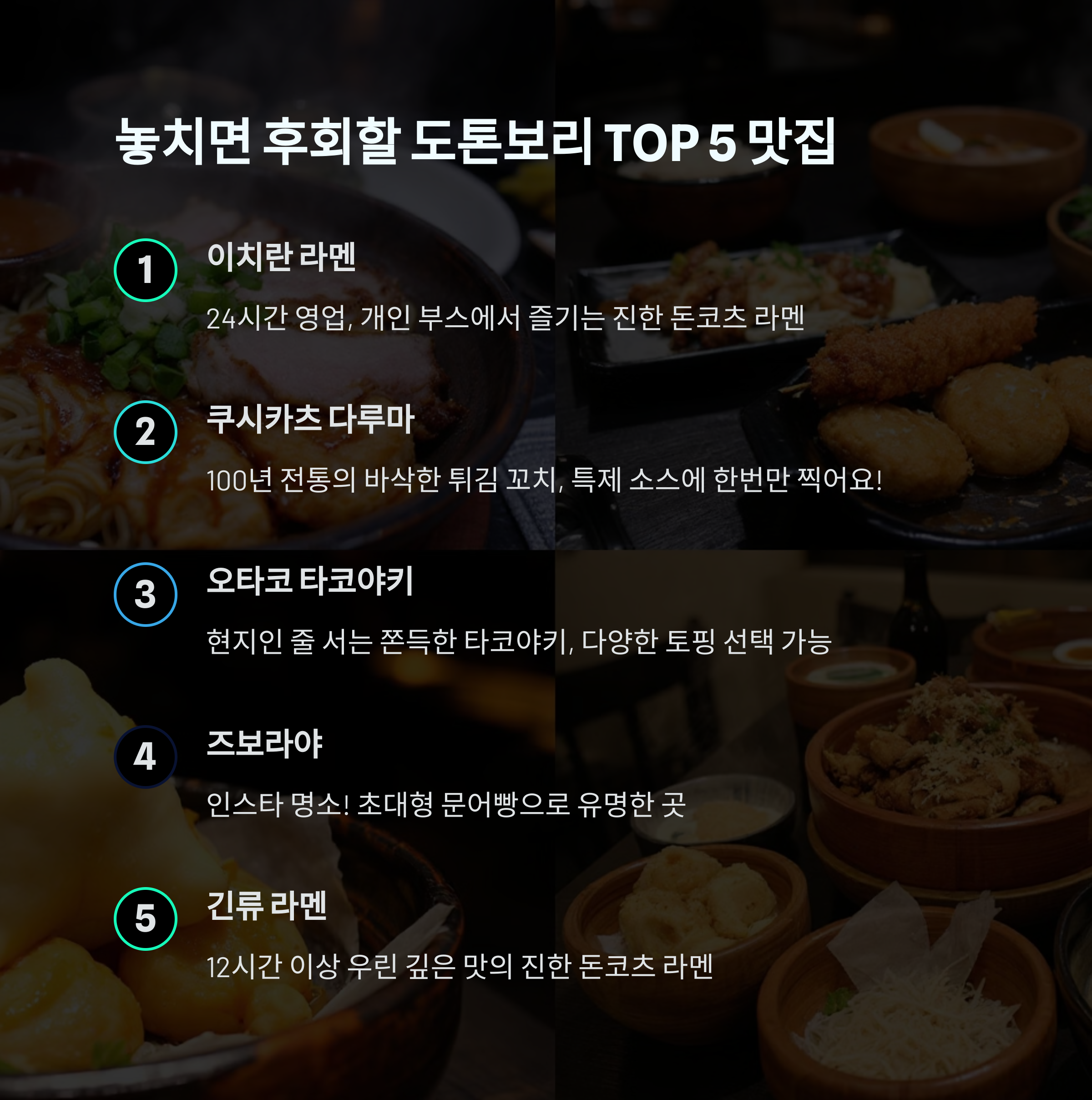 도톤보리에 가면 정말 너무 많은 맛집들이 있어서 어디를 가야 할지 고민되실 거예요. 제가 직접 가보고 맛있었던 TOP 5 맛집을 소개해드릴게요! 😋