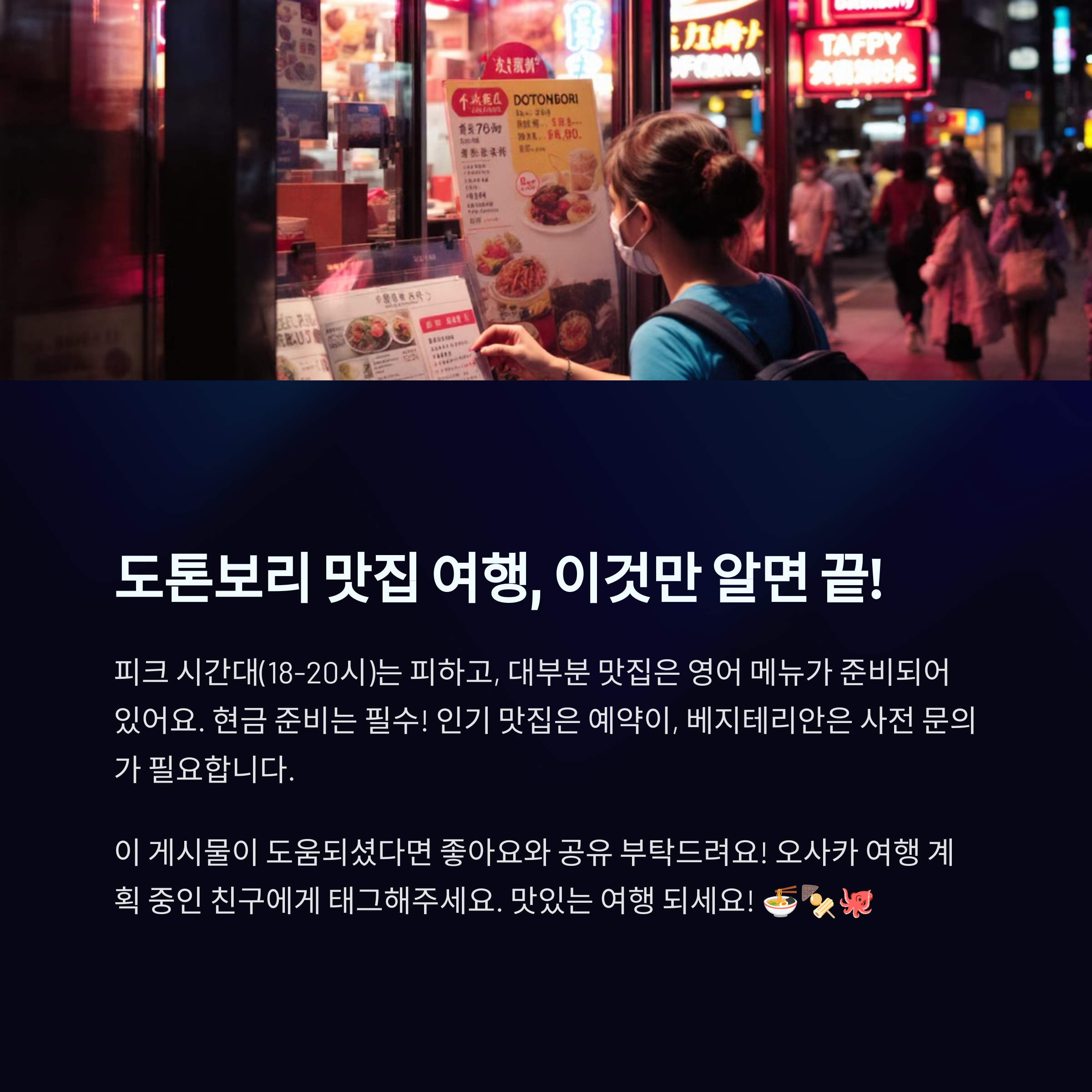 파이팅! 도톤보리 맛집 정복에 도전해보세요! 🔥 한국어로 된 메뉴판이 있는 가게도 많지만, 사진이 있는 메뉴판이 대부분이라 주문하기 어렵지 않을 거예요.