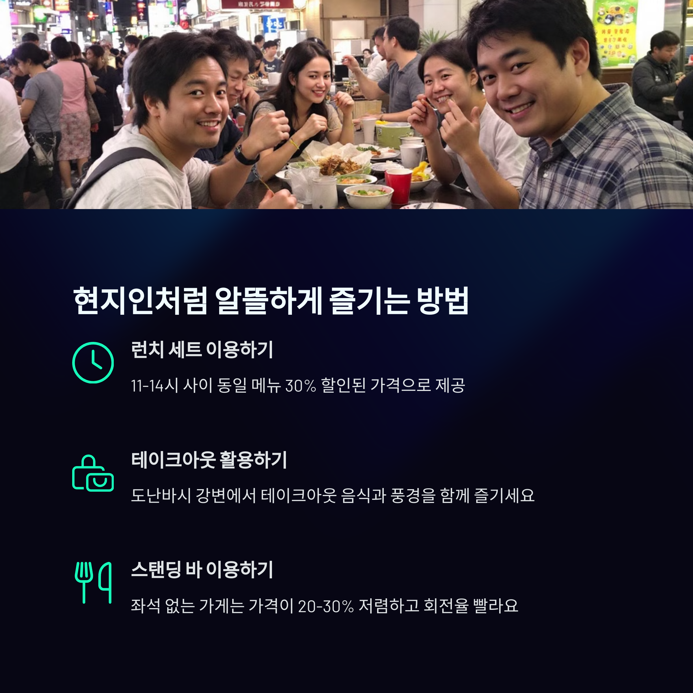 먼저, 런치 세트를 노려보세요! 동일한 메뉴라도 점심에는 저녁보다 20-30% 저렴한 경우가 많아요. 오사카 웰컴 쿠폰도 미리 다운받아가면 좋아요.