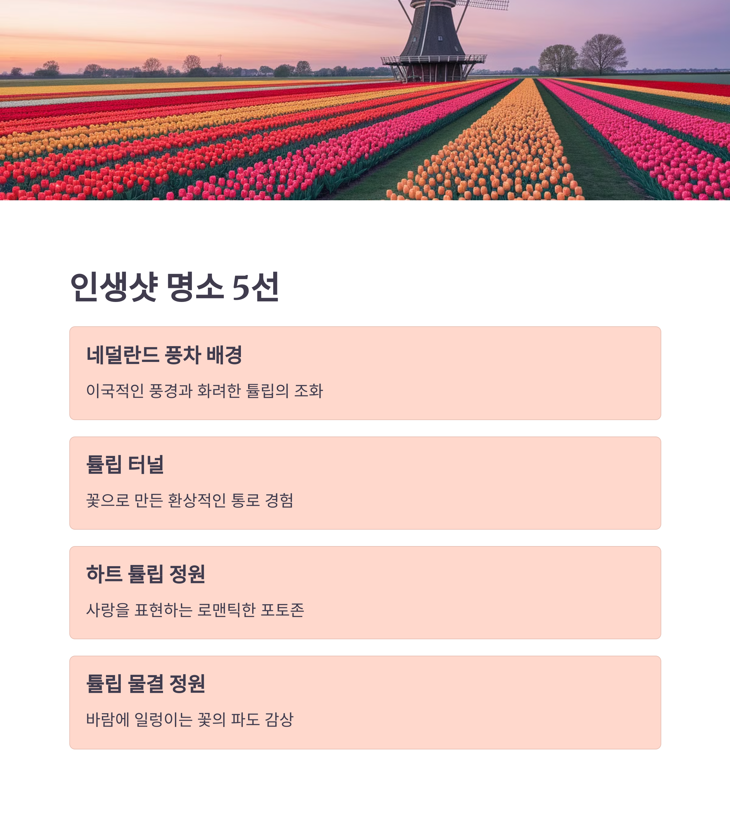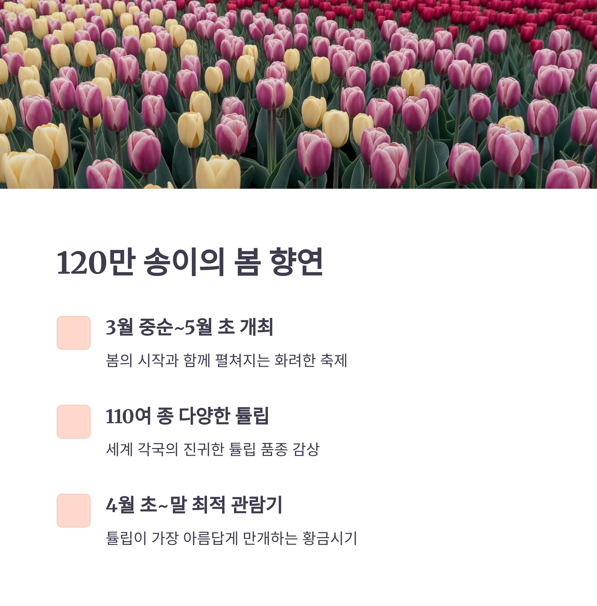| 튤립축제 최적의 방문 시기는 언제인가요? | 튤립이 가장 아름답게 만개하는 4월 초부터 4월 말까지가 최적의 시기예요. 특히 평일 오전에 방문하면 한적하게 즐길 수 있답니다. |