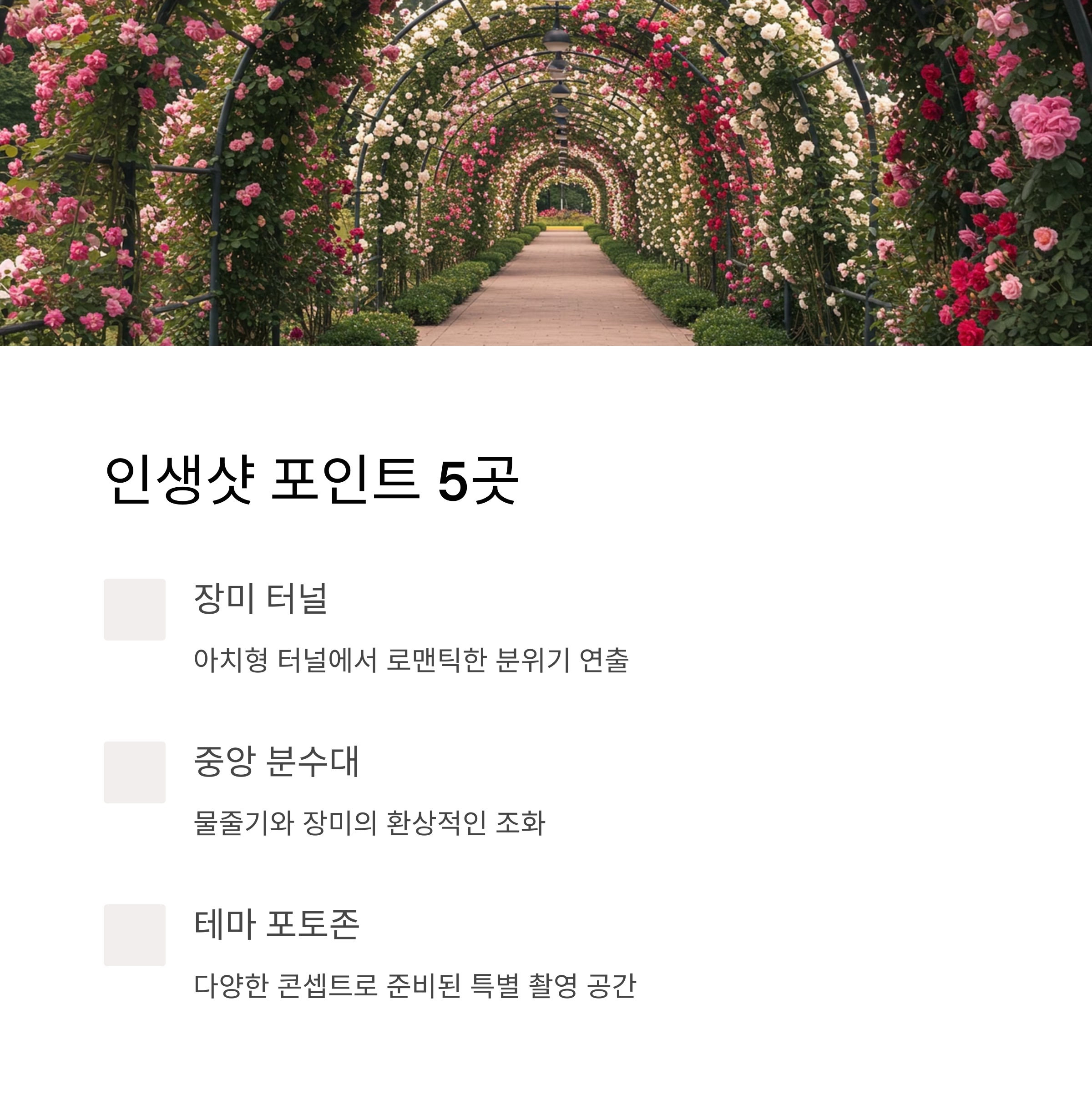 첫 번째는 바로 장미 터널이에요. 붉은 장미가 아치형으로 우거진 이 터널은 마치 동화 속 한 장면처럼 환상적인 사진을 남길 수 있답니다.