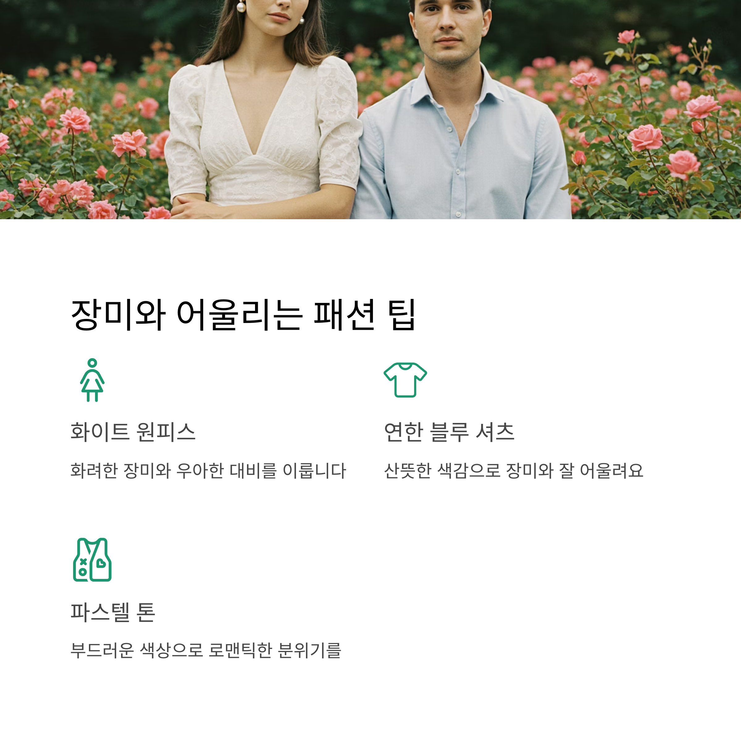 그리고 플로럴 패턴의 의상도 장미원의 분위기와 잘 어울려요. 하지만 너무 복잡한 패턴은 배경과 경쟁할 수 있으니 심플한 것이 좋아요.