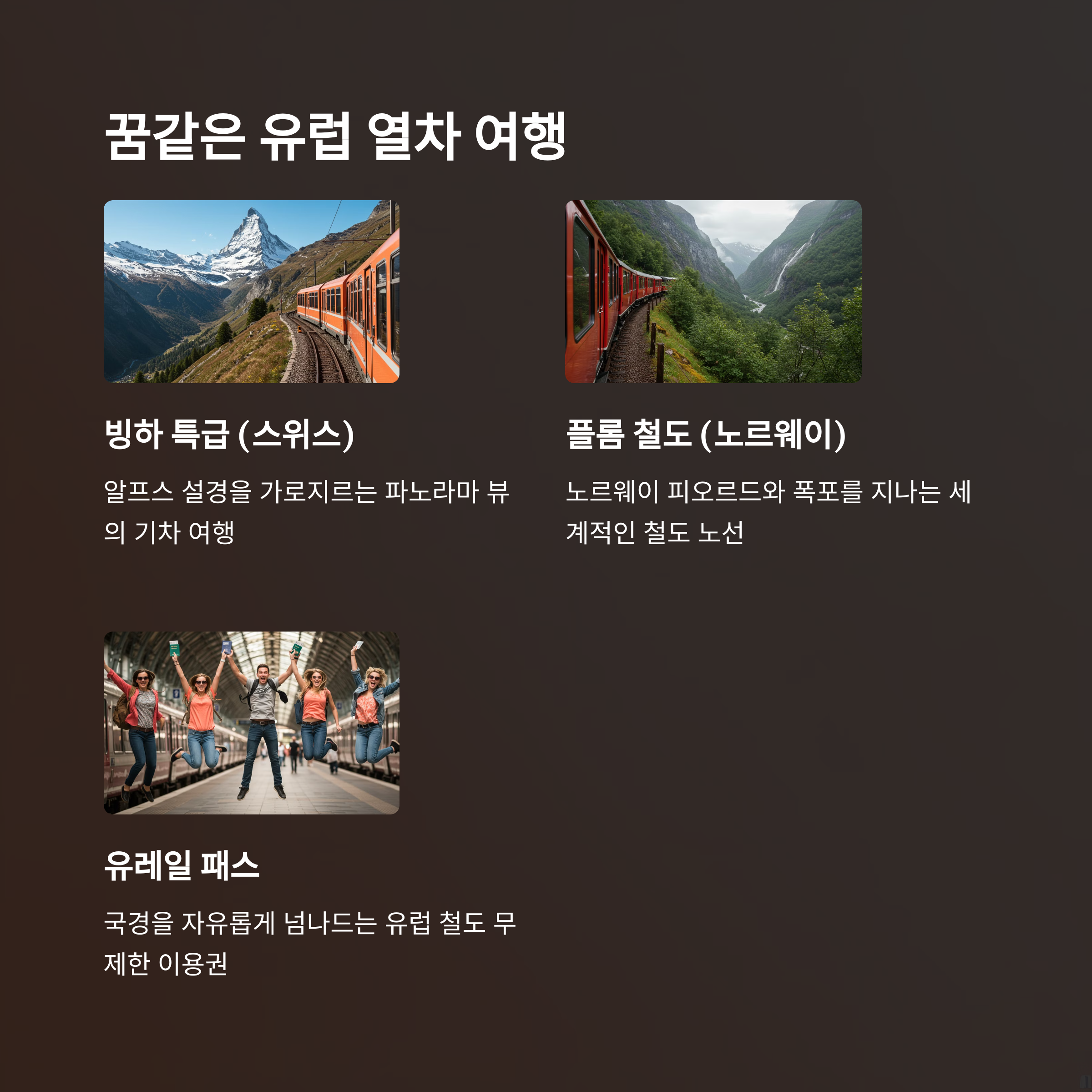 유럽 열차 여행은 편안하면서도 다양한 풍경을 감상할 수 있는 최고의 이동 수단입니다.