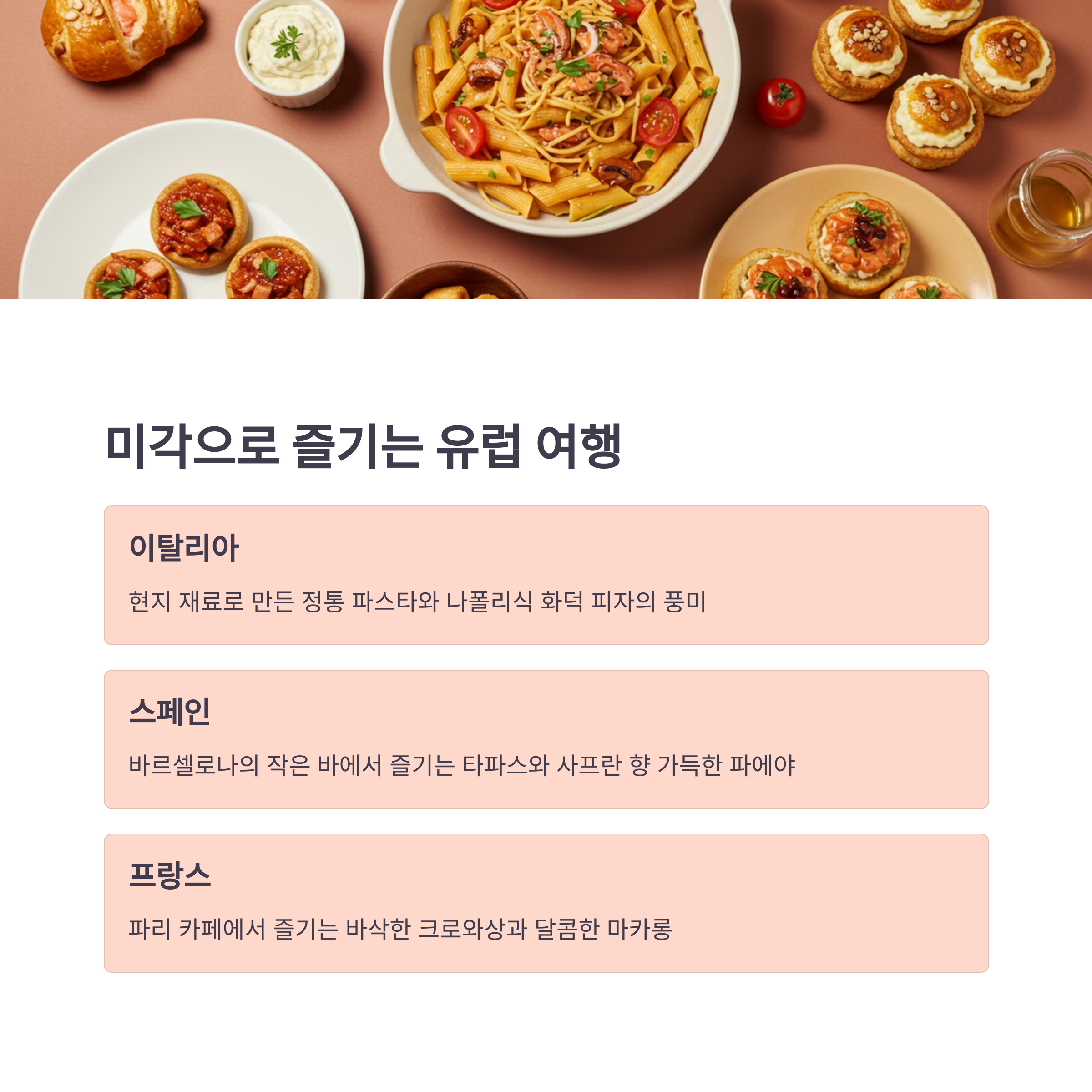 이탈리아의 정통 피자와 파스타, 스페인의 타파스, 프랑스의 코스 요리 등 각 나라마다 특색 있는 요리를 맛보는 것은 꼭 해봐야 할 경험이죠.
