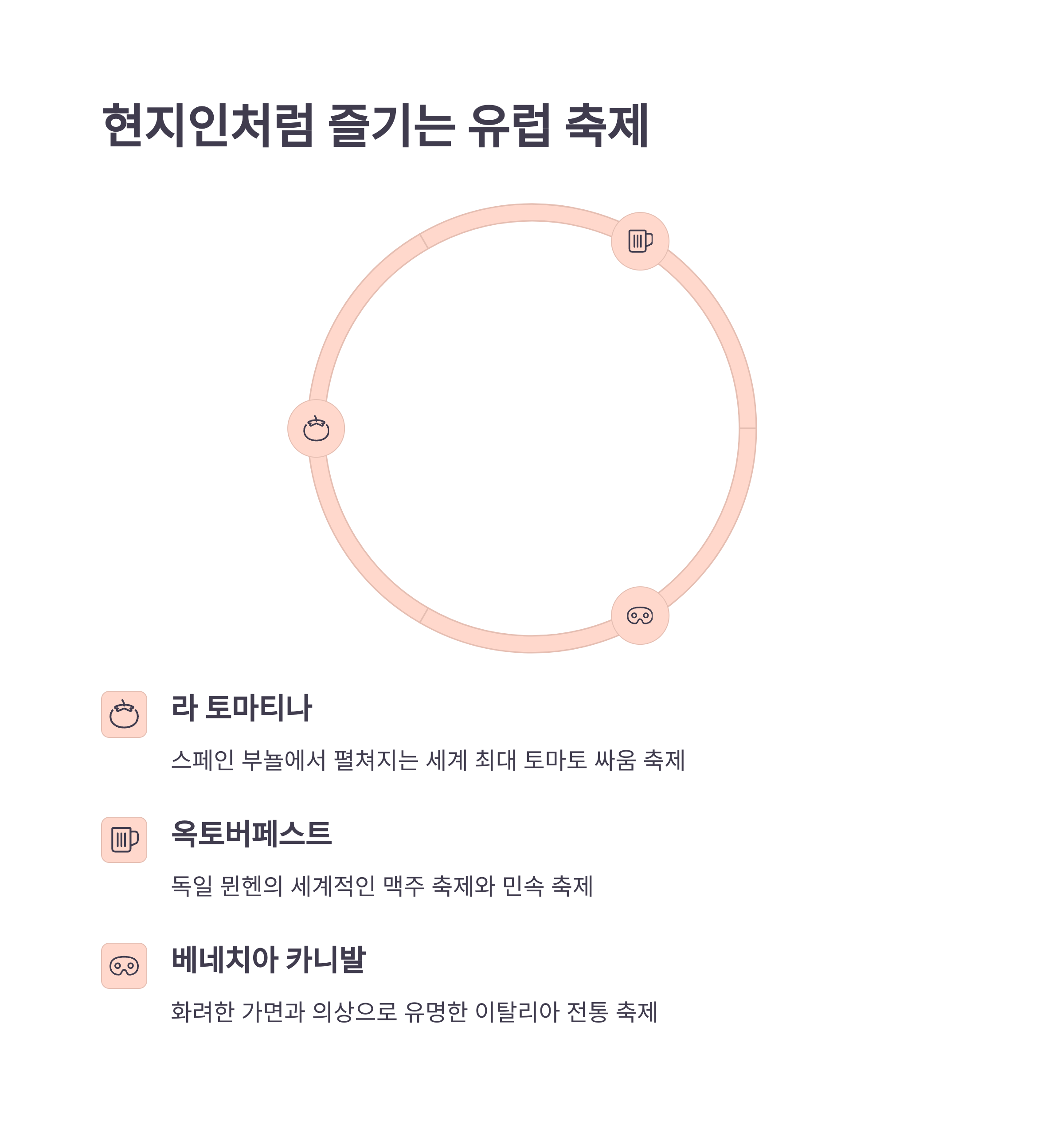 스페인의 라 토마티나, 독일의 옥토버페스트, 이탈리아 베니스의 카니발 등 다양한 축제가 연중 열립니다.