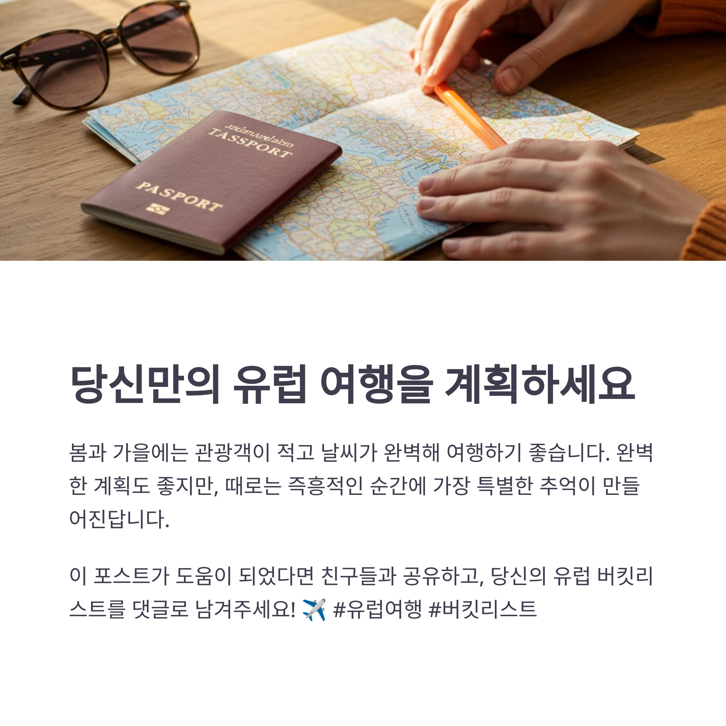 이 글에서 소개한 버킷리스트들은 유럽 여행을 더욱 풍요롭고 의미 있게 만들어 줄 거예요.