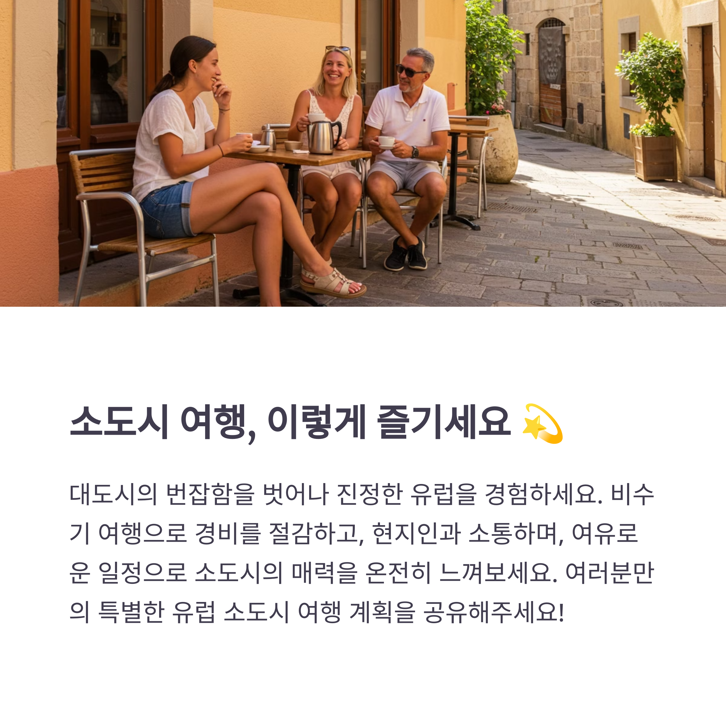 | 소도시 교통은 어떻게 해결하나요? | 대부분의 유럽 소도시는 기차나 버스로 접근 가능해요. 도시 내부는 대부분 걸어서 다닐 수 있을 만큼 작답니다. 렌터카를 이용한다면 주차 문제를 미리 확인하세요. 많은 소도시는 차량 진입이 제한되어 있어요. |