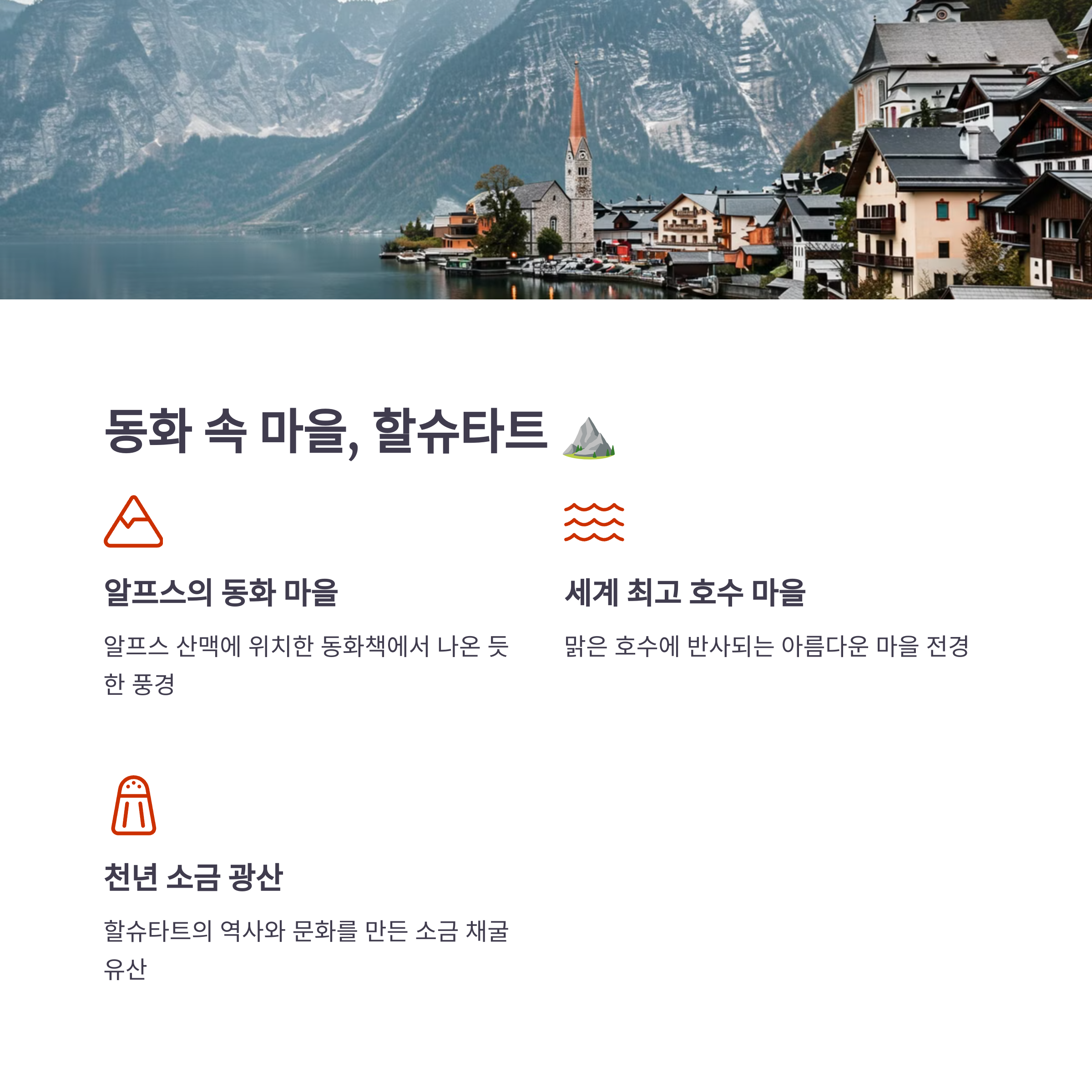 오스트리아의 할슈타트(Hallstatt)는 마치 동화책에서 튀어나온 듯한 아름다운 마을이에요. 알프스 산맥 아래 할슈타트 호수 옆에 자리 잡은 이 작은 마을은 유네스코 세계문화유산으로 지정되어 있답니다. 🏔️