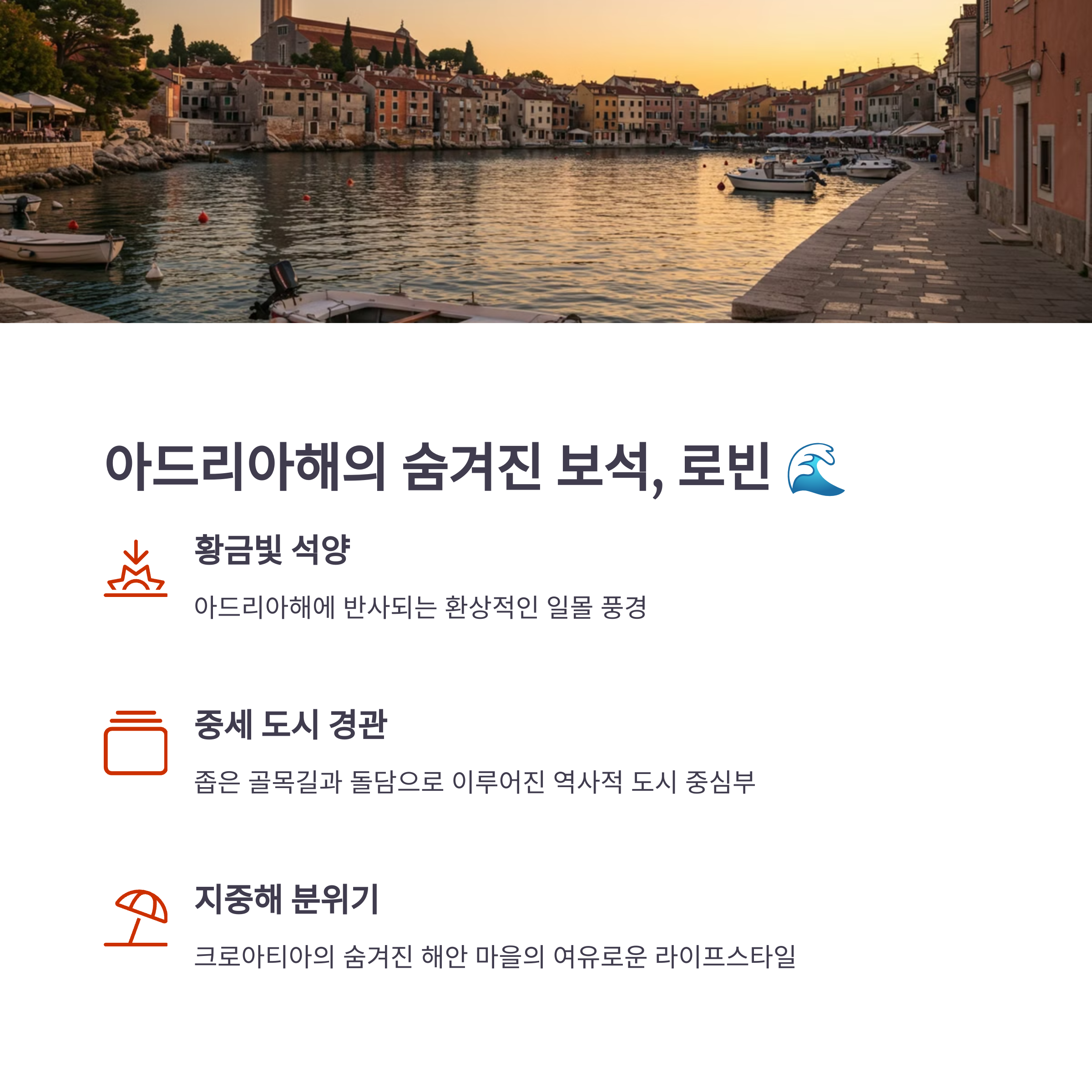 아드리아 해 연안에 위치한 크로아티아의 로빈(Rovinj)은 이스트리아 반도의 가장 매력적인 해안 도시 중 하나예요. 베네치아의 영향을 받은 이 아름다운 항구 도시는 좁은 골목길과 파스텔 톤 건물들이 특징이랍니다. 🐚