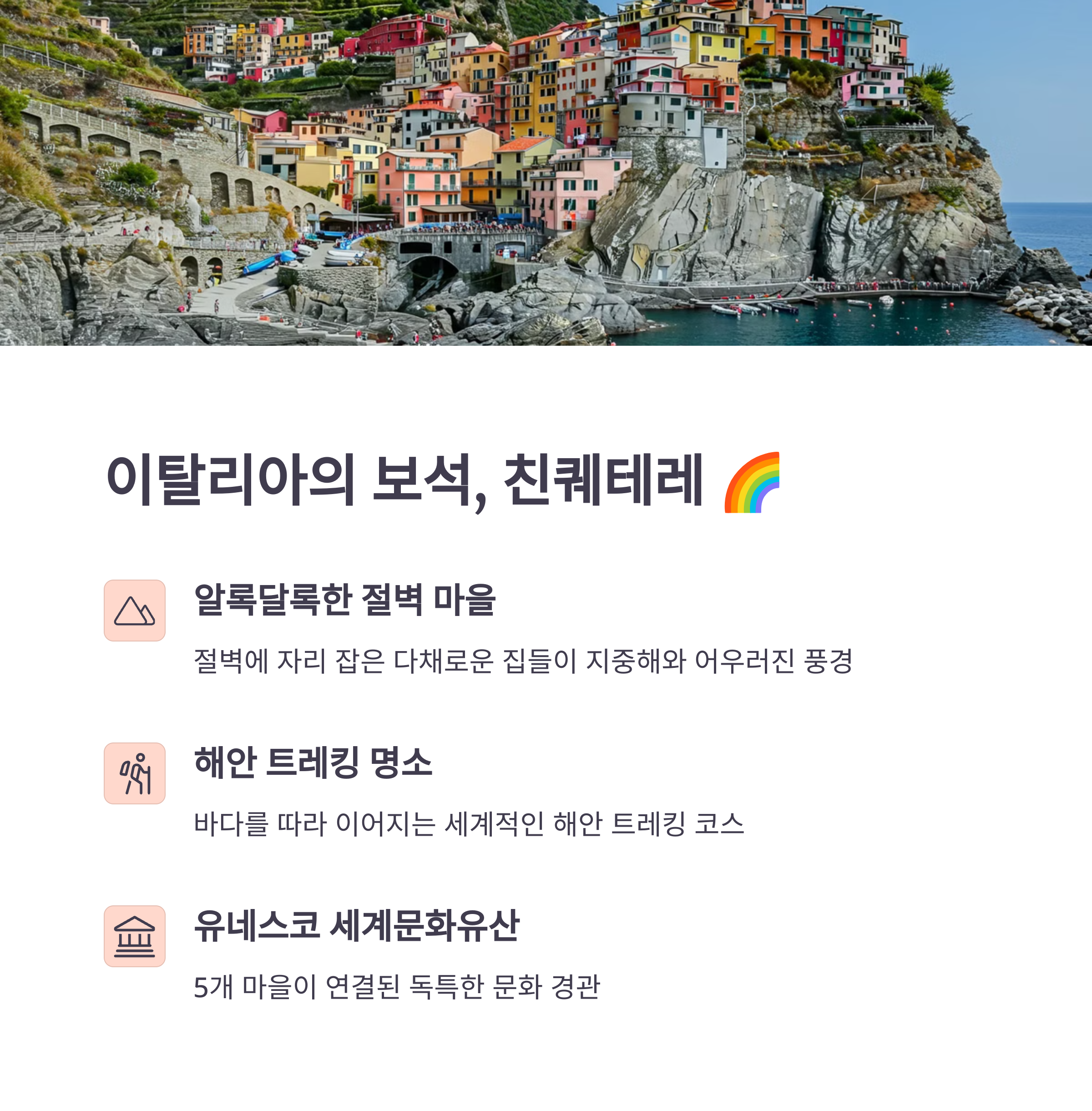 이탈리아 북서부 해안에 위치한 친퀘테레(Cinque Terre)는 '다섯 개의 땅'이라는 뜻으로, 다섯 개의 작은 어촌 마을로 이루어져 있어요. 몬테로소 알 마레, 베르나차, 코르닐리아, 마나롤라, 리오마조레 이 다섯 마을이 절벽에 아슬아슬하게 자리 잡고 있답니다. 🏘️