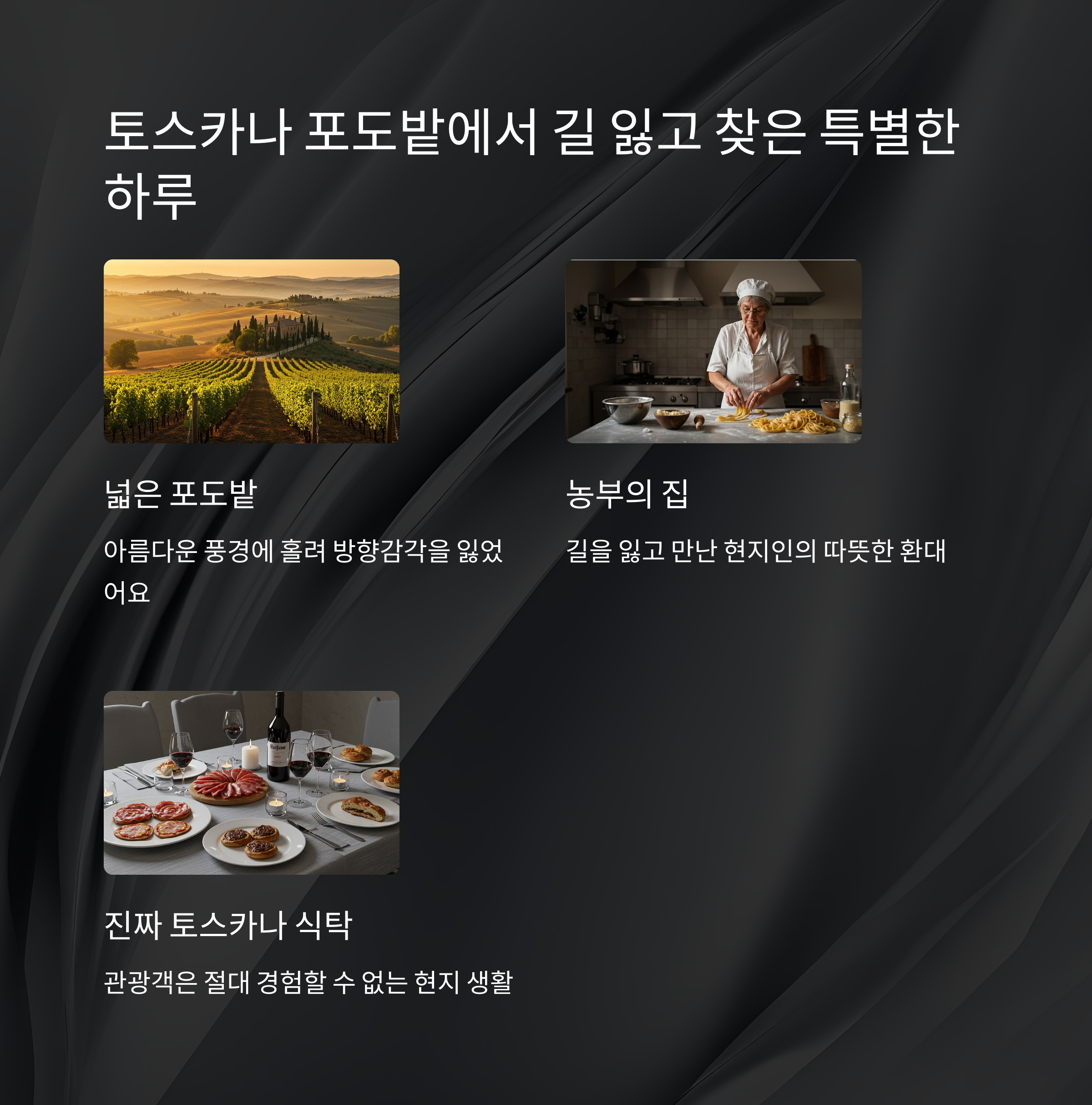 길을 찾아 헤매던 중 우연히 만난 현지 농부 할아버지가 절 자신의 집으로 초대해주셨어요. 거기서 직접 만든 수제 와인과 올리브 오일을 맛보게 해주셨는데, 그날의 즉흥적인 경험이 오히려 여행 중 최고의 순간이 되었답니다.