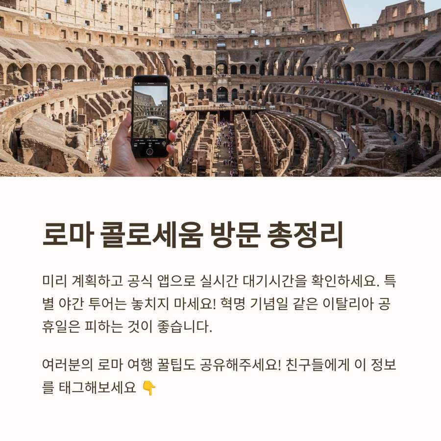 이렇게 로마 콜로세움 온라인 예매에 관한 모든 꿀팁을 알려드렸어요! 이 정보들이 여러분의 로마 여행을 더욱 즐겁고 편안하게 만들어 주길 바랍니다. 💖