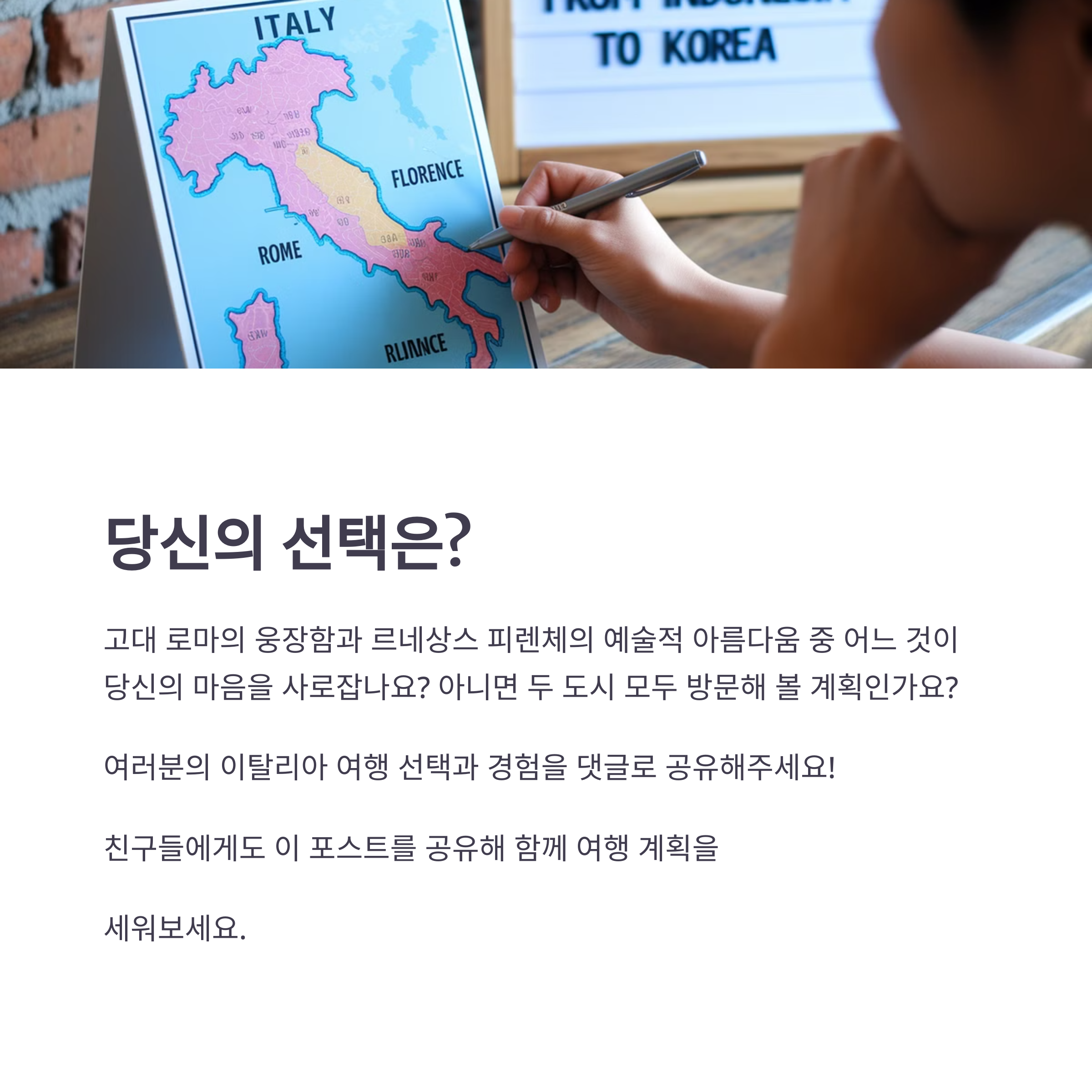 여러분의 여행이 어떤 도시에서든 멋진 경험이 되길 바랍니다! 이탈리아의 매력에 푹 빠져보세요!
