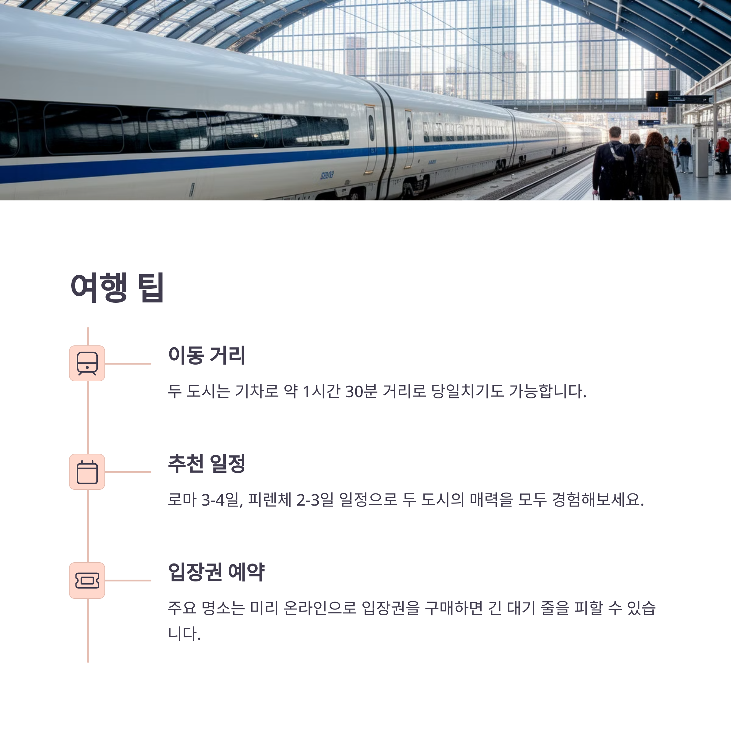 물론, 가장 이상적인 방법은 두 도시 모두 방문하는 것이에요! 로마와 피렌체 사이에는 기차로 약 1시간 30분 거리랍니다. 트레니탈리아의 고속철도를 이용하면 편리해요.