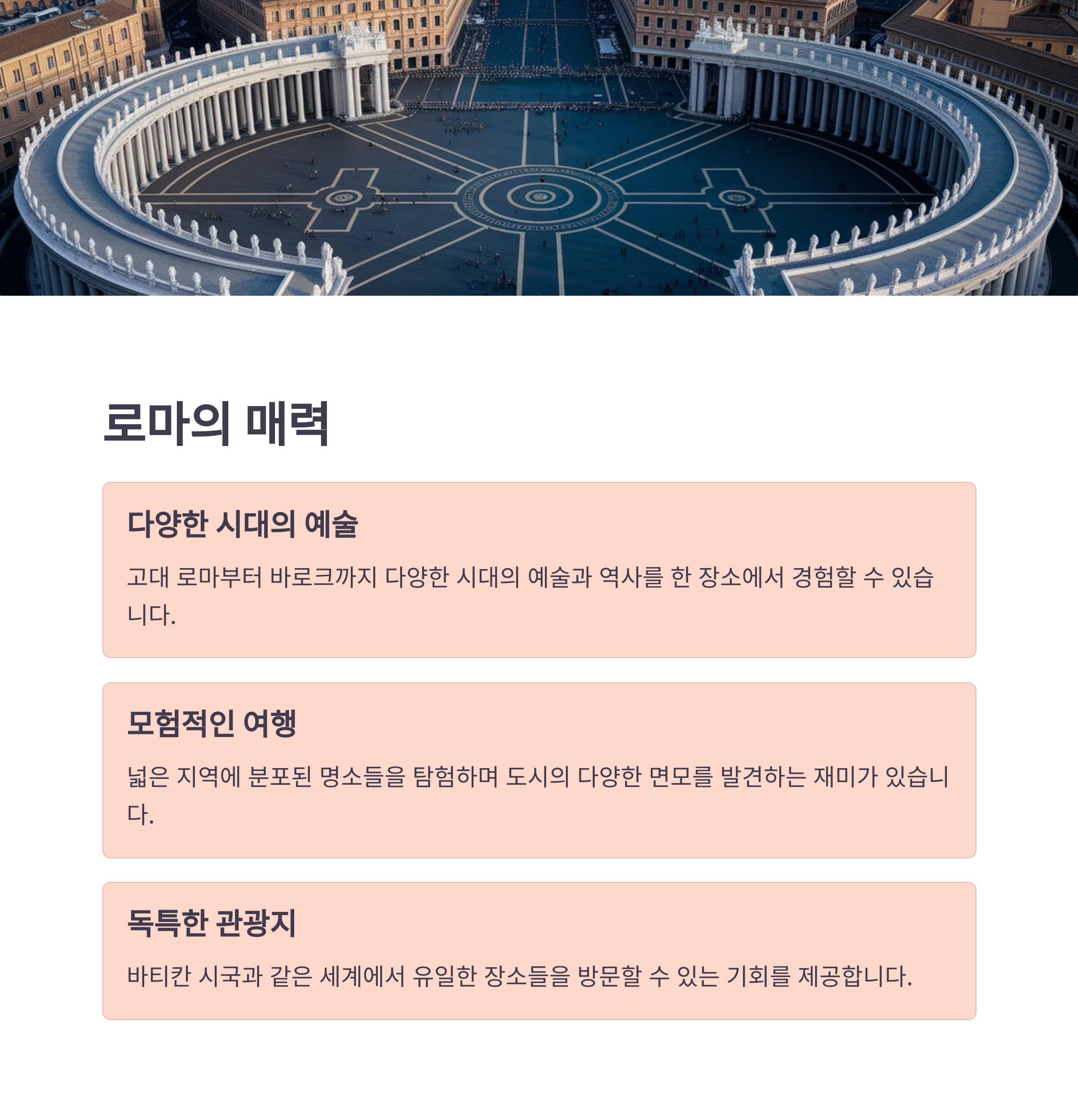 | 주요 볼거리 | 고대 로마 유적, 바티칸 | 르네상스 예술, 두오모 |