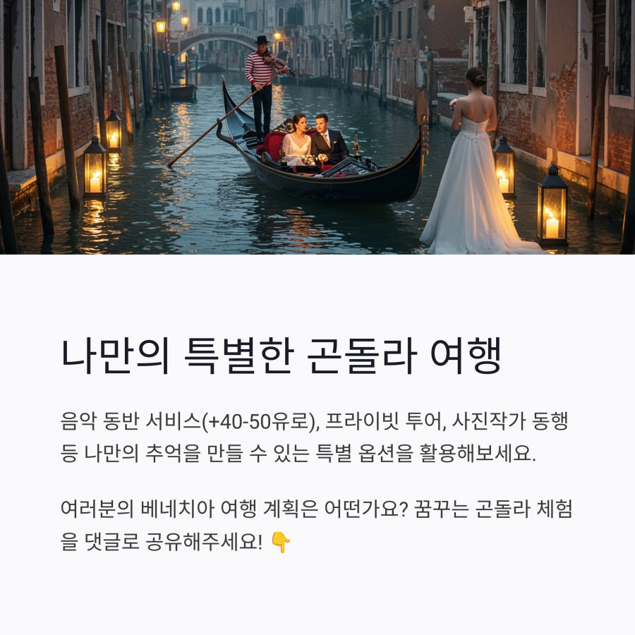 안녕하세요! 오늘은 로맨틱한 물의 도시 베네치아에서 꼭 경험해봐야 할 곤돌라 투어에 대해 이야기해볼게요. 베네치아 여행을 계획 중이신가요? 곤돌라는 꼭 타보고 싶은데 비싸다는 이야기도 많고, 어떻게 예약해야 할지 모르겠다고요?