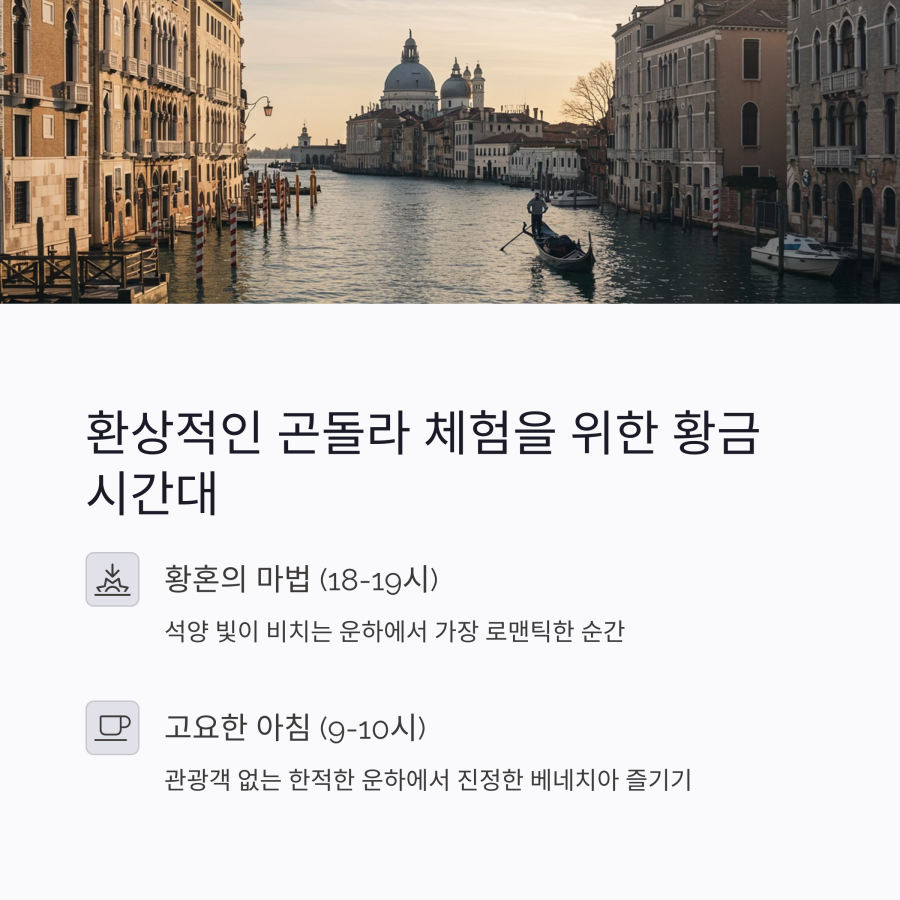 곤돌라 체험의 질은 시간대와 장소 선택에 크게 영향을 받습니다. 가장 아름다운 경험을 원한다면 일몰 시간(18:00~19:00)을 추천해요. 붉게 물든 하늘과 함께하는 곤돌라는 특별한 추억이 될 거예요.