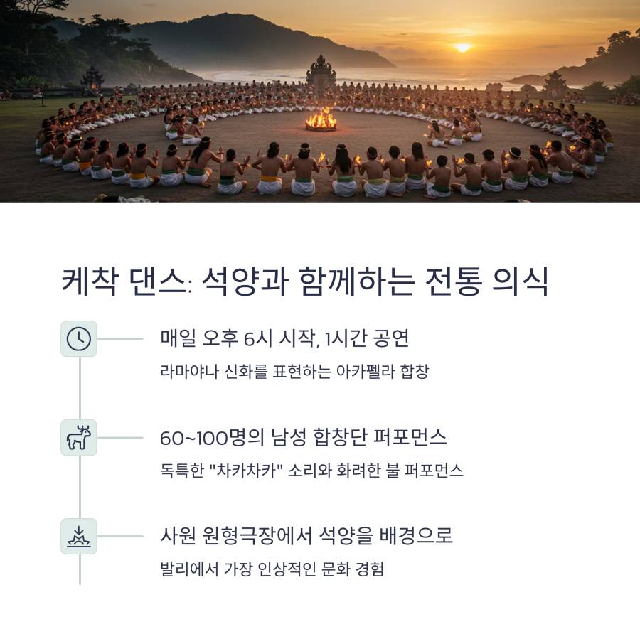 울루와뚜 사원에서 펼쳐지는 케착 댄스(Kecak Dance)는 라마야나 서사시를 바탕으로 한 발리 전통 공연이에요. 🔥