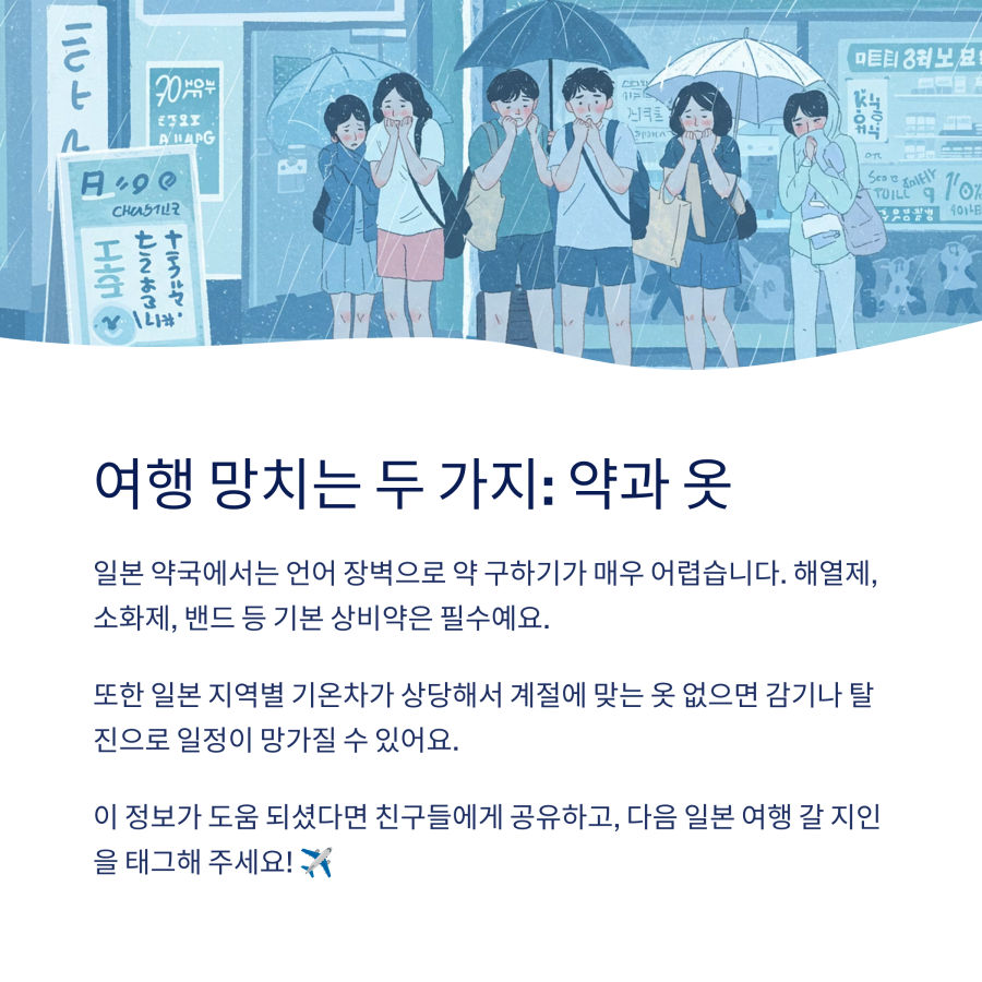 우산이나 방수 자켓도 유용하니 꼭 챙기세요. 일본은 갑작스러운 비가 잦은 편이에요.