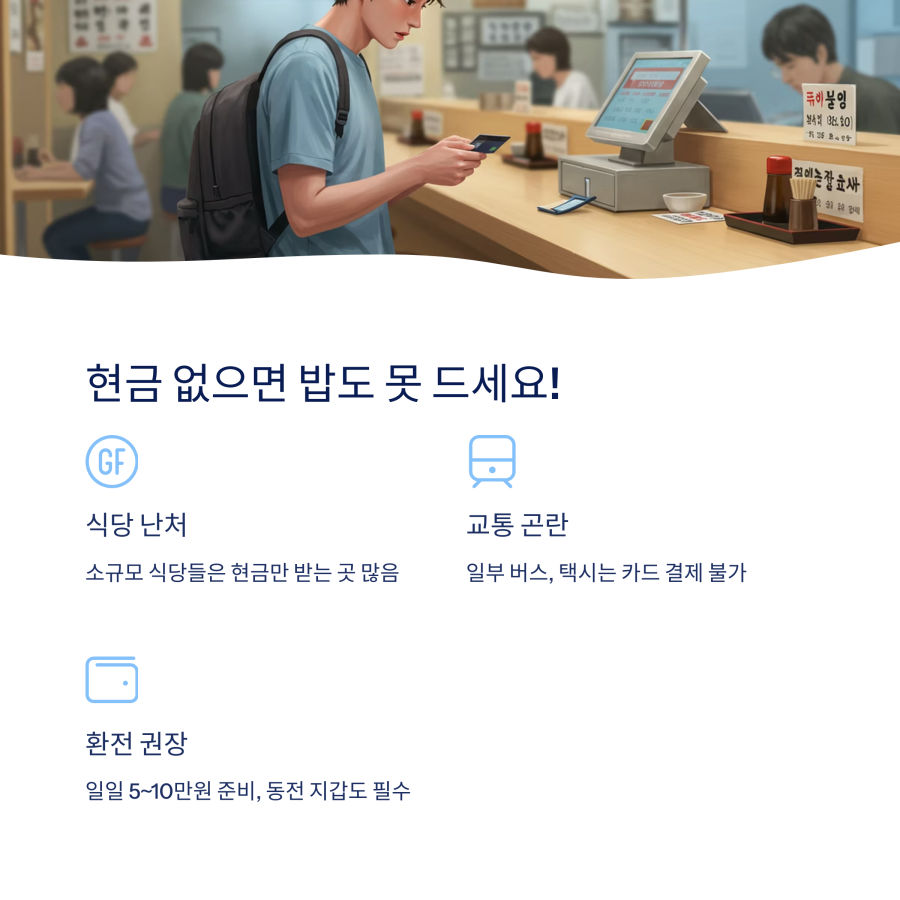 | 현금/카드 | 식사/쇼핑 불가 | 현지 환전소 이용 | 분산 보관 |