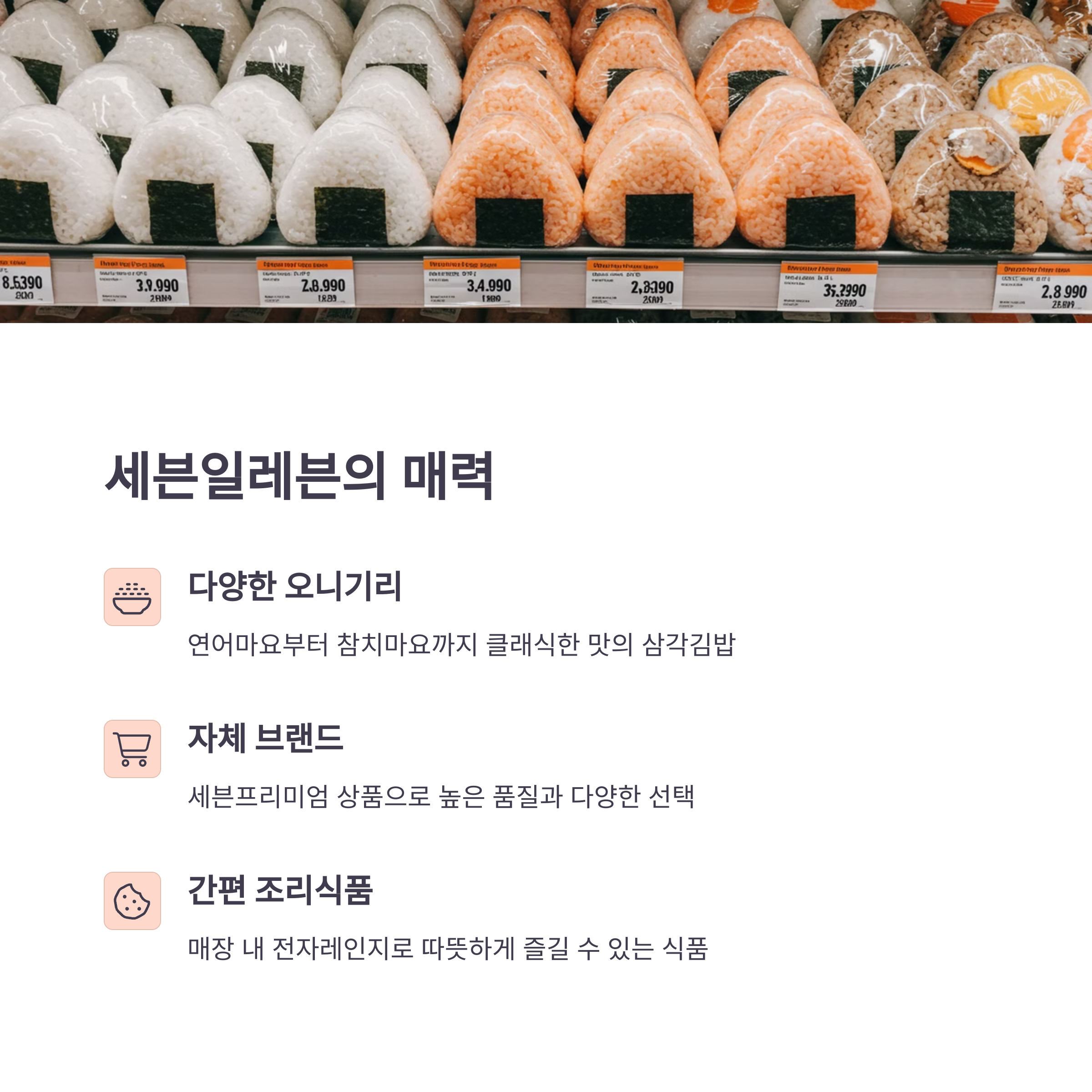 | 세븐일레븐 | 오니기리 종류가 다양하고 자체 브랜드 상품 퀄리티가 높음 |