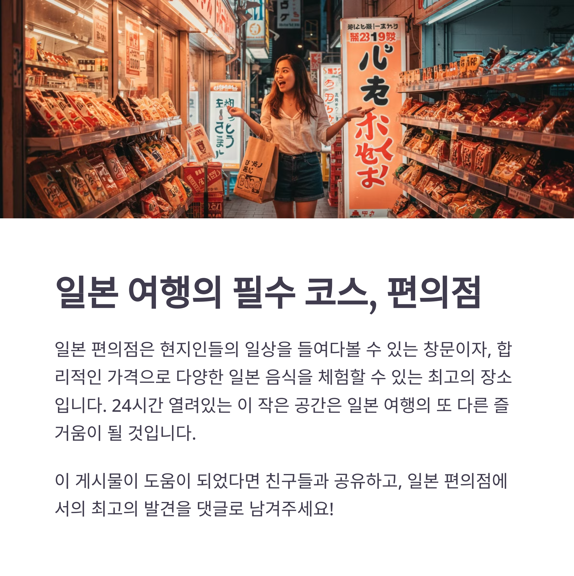 일본 편의점은 단순한 상점이 아닌 일본 식문화의 창구예요. 여행 중 현지인처럼 편의점을 즐기며 특별한 경험을 해보세요!