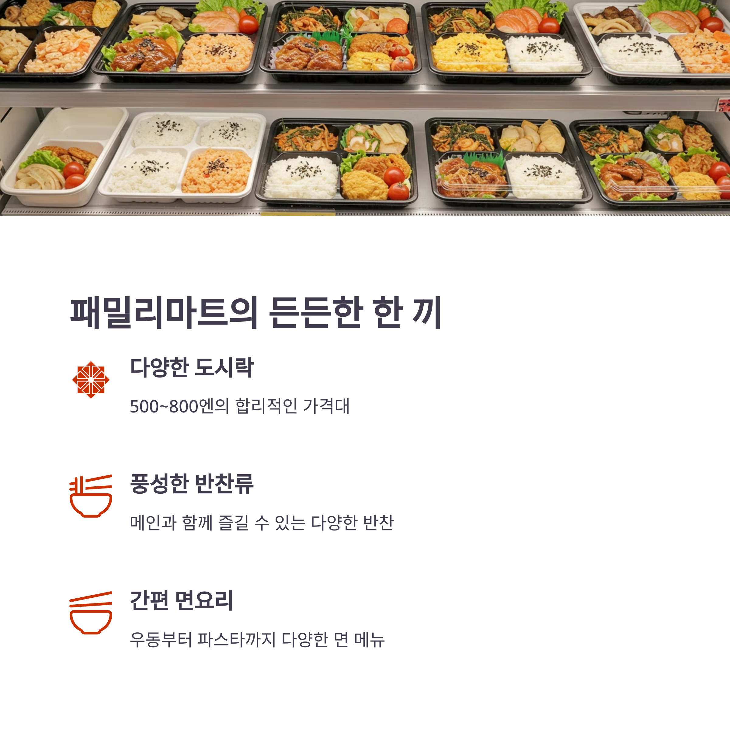| 패밀리마트 | 도시락과 반찬류가 특화되어 있으며 시즌 한정 상품이 다양함 |