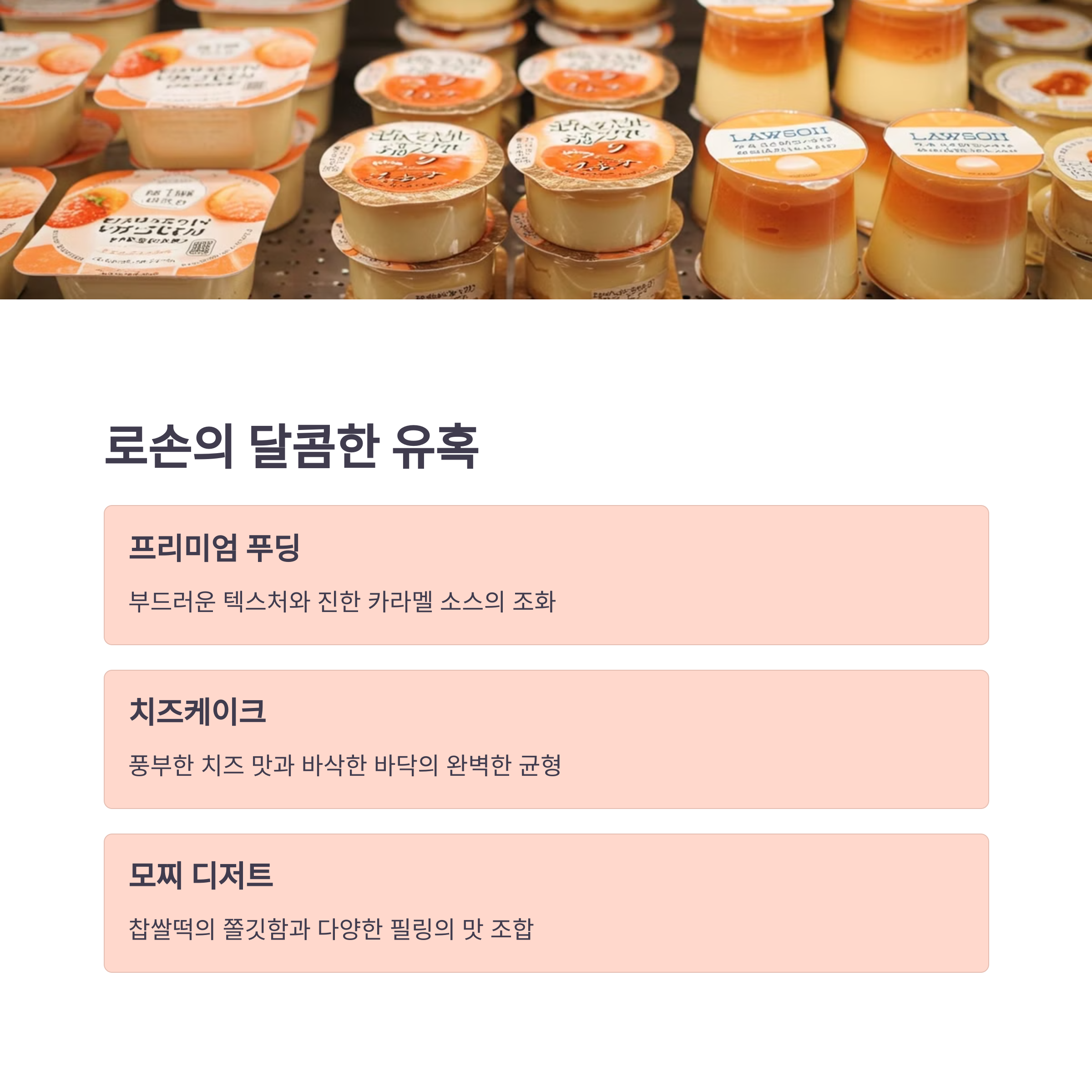 | 로손 | 디저트와 스위츠류가 특히 맛있으며 프리미엄 상품이 많음 |