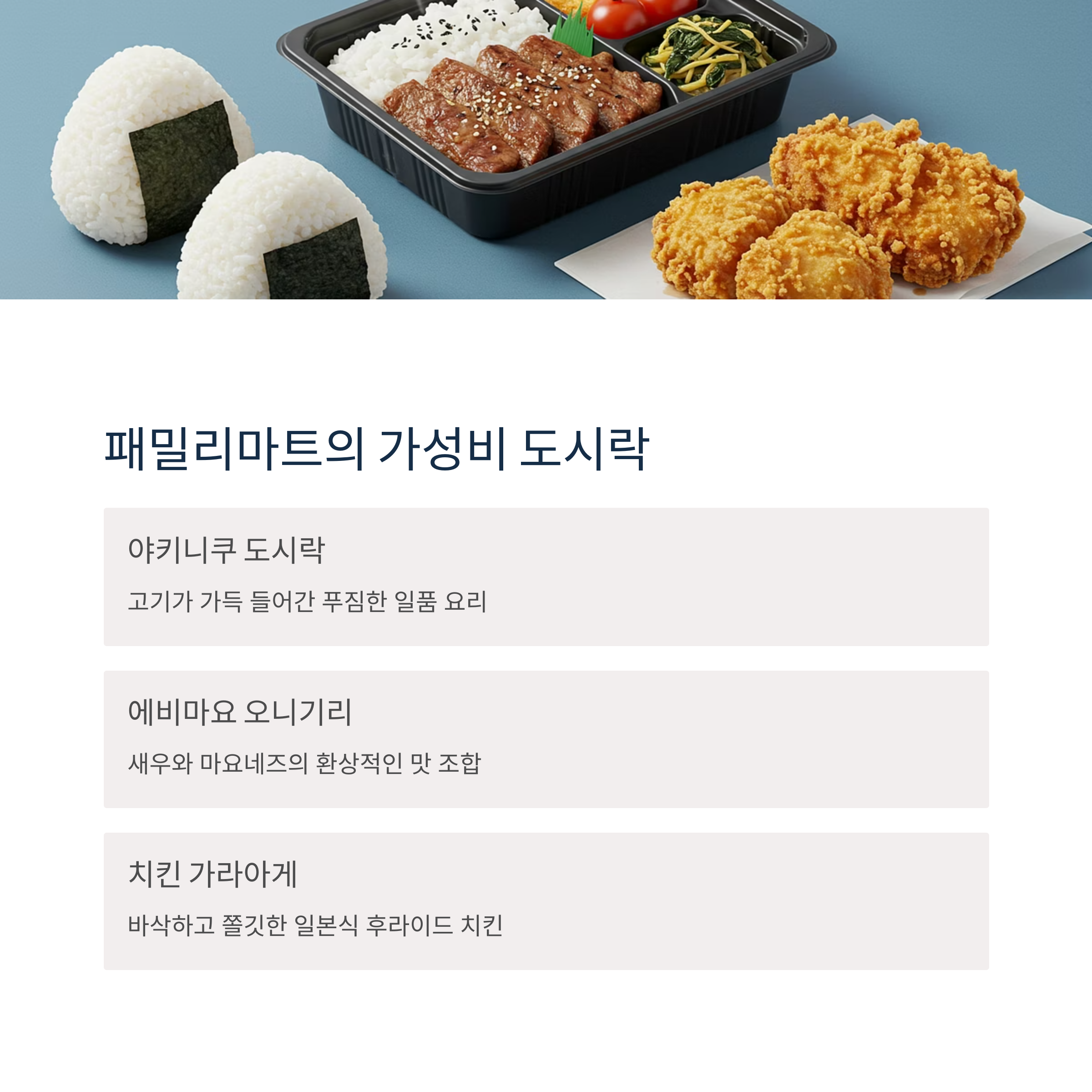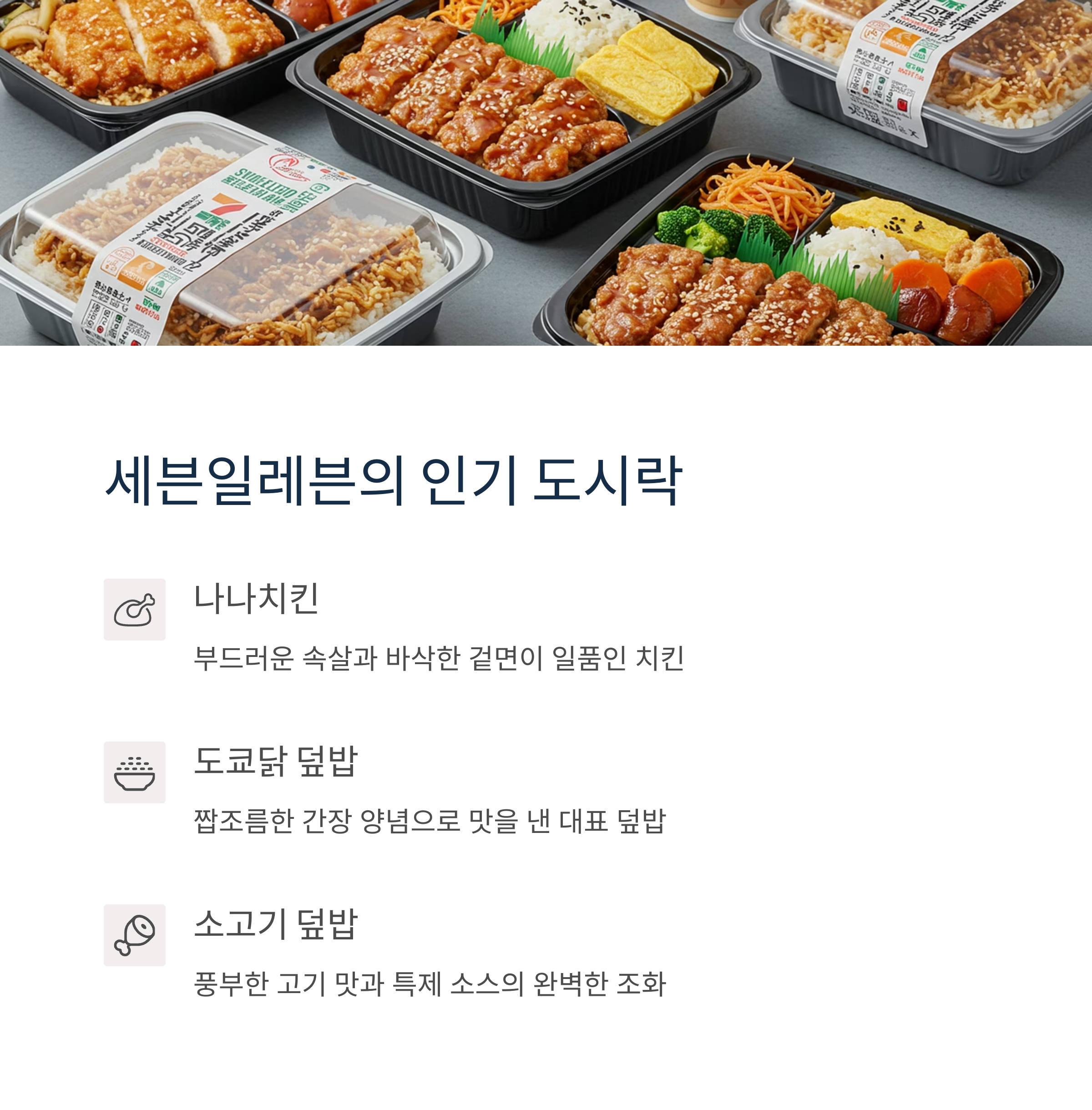 | 나나치킨 + 에그 샌드위치 | 연어 하라스 밥 + 구운 오니기리 | 야키니쿠 도시락 + 타마고 샌드 |