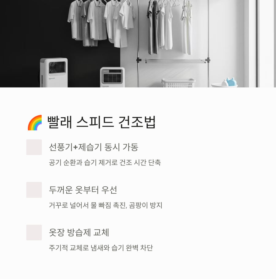 실내에서 빨래를 말릴 때는 선풍기와 제습기를 함께 사용하는 게 포인트예요.