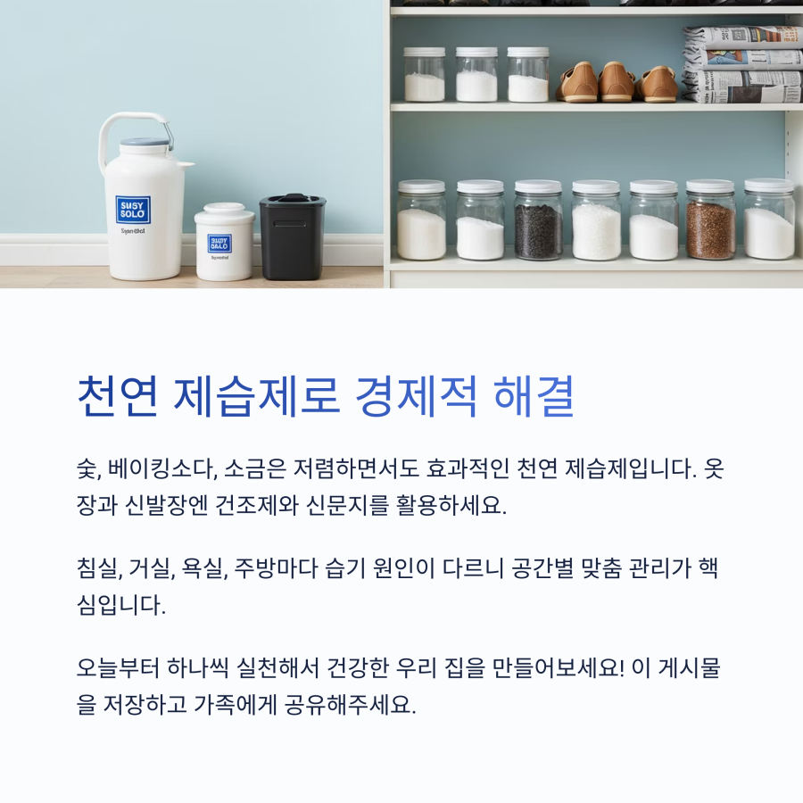 시중에 파는 제습제도 좋지만, 천연 재료로도 충분히 효과를 볼 수 있어요.**숯, 베이킹소다, 소금** 등은 대표적인 천연 제습제로 안전하고 경제적입니다. 💰