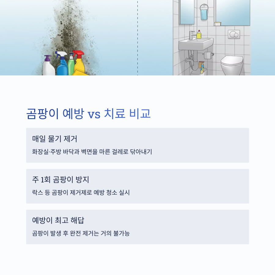 특히 화장실, 주방, 베란다 같은 습한 곳은 매일 물기를 닦아주시고, 일주일에 한 번은 곰팡이 방지 세제로 청소해 주세요. 🧹