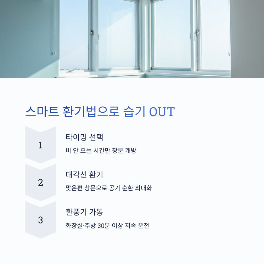 장마철에는 **비가 오지 않는 시간대를 노려서** 짧고 강하게 환기하는 것이 핵심입니다.