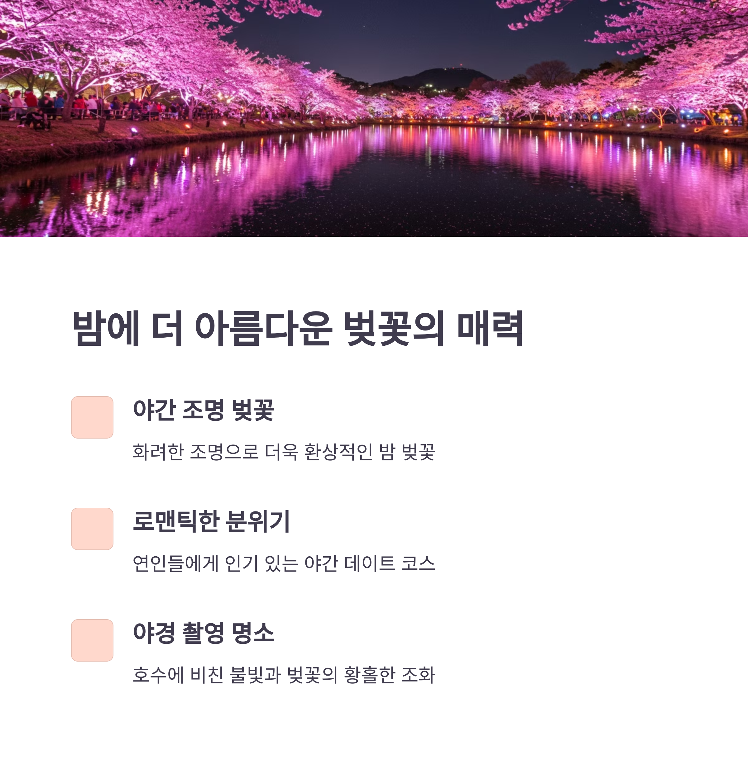 특히 야간 벚꽃 조명이 설치되어 밤에 방문해도 아름다운 풍경을 감상할 수 있어요.
