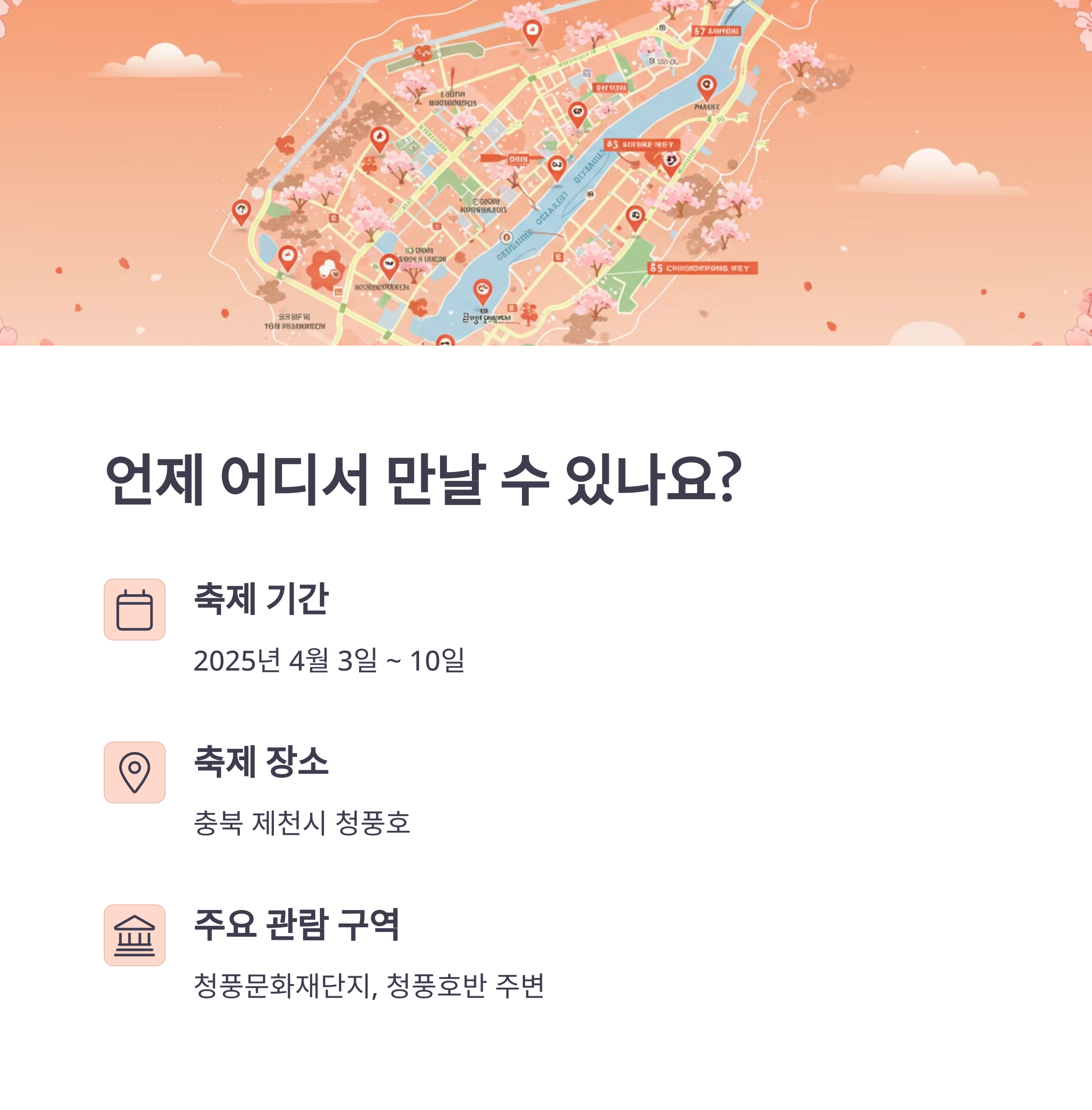 | 청풍호 벚꽃축제는 언제 열리나요? 매년 4월 초~중순경에 개최되며, 벚꽃 개화 시기에 맞춰 일정이 조정됩니다. 2025년에는 4월 3일부터 10일까지 예정되어 있습니다. |
