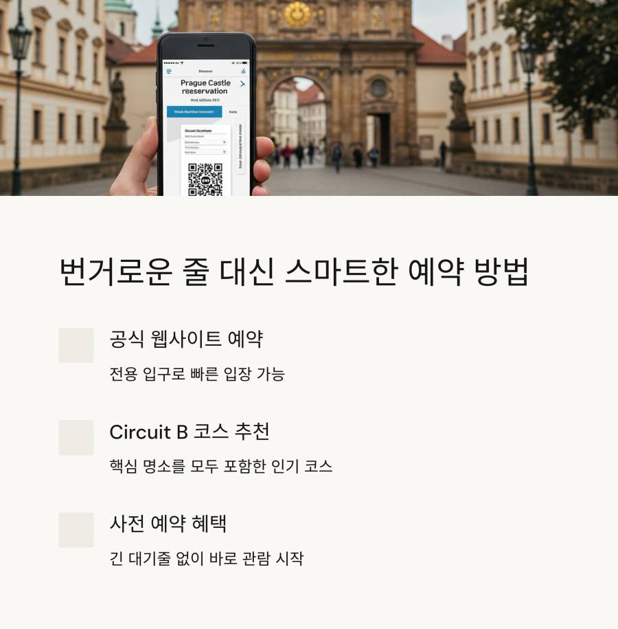 프라하 성을 방문할 때 가장 스마트한 방법은 바로 온라인 티켓 예약이에요! 이렇게 하면 현장에서 길게 줄 서는 시간을 절약할 수 있답니다. 🕒