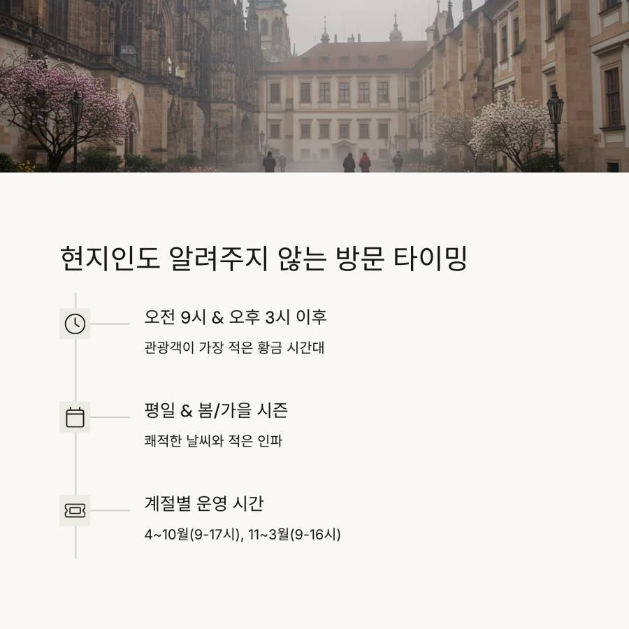 프라하 성을 방문하기에 가장 좋은 시간대는 언제일까요? 경험에 따르면 평일 오전 9시 오픈 직후나 오후 3시 이후가 가장 한산한 편이에요. 🕘