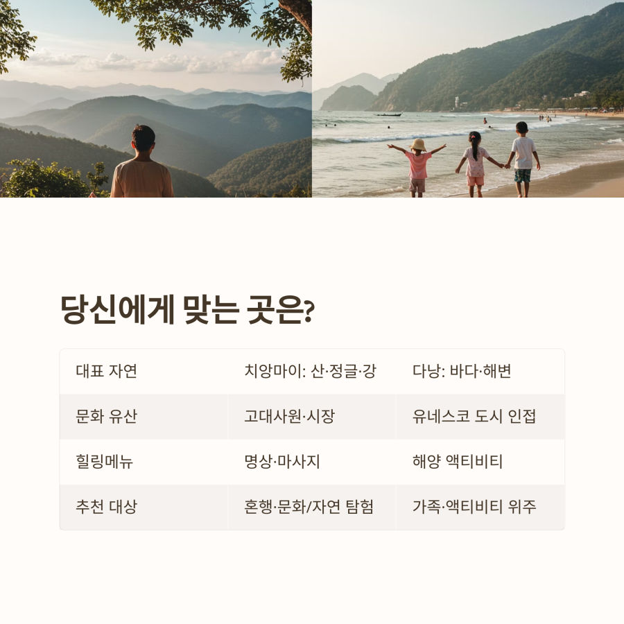 | 적합한 여행객 | 문화/자연 애호가 | 해변/휴양 선호자 |