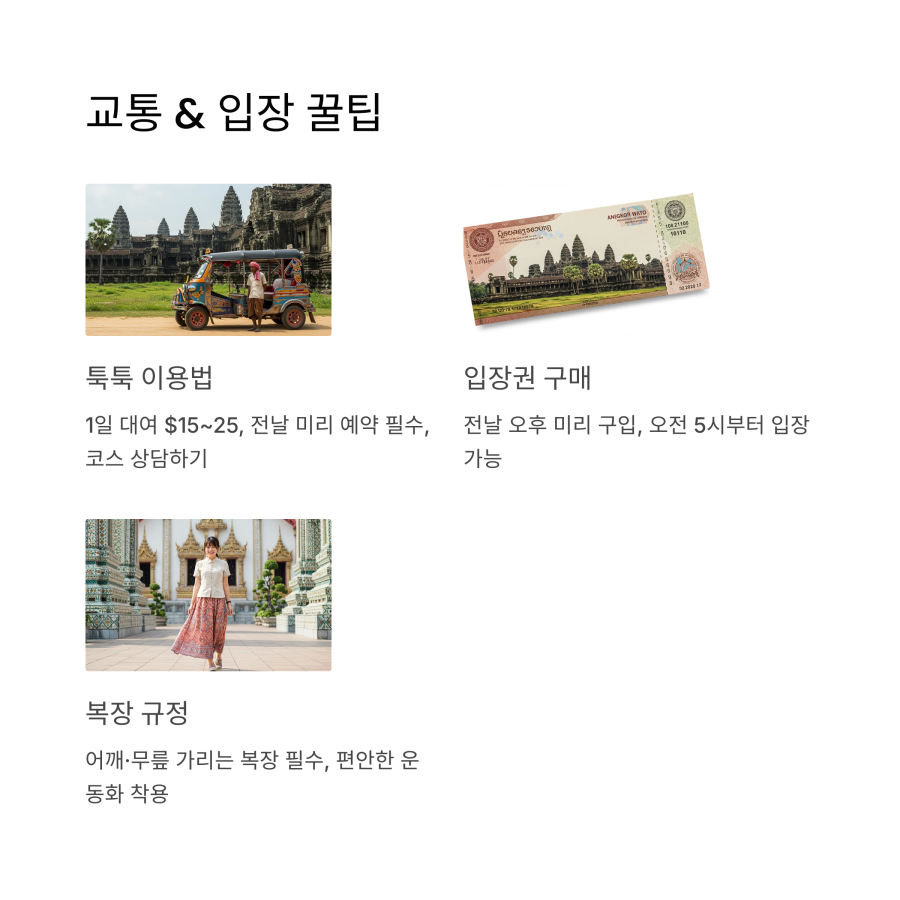 또한 앙코르 유적지는 복장 규정이 있어요. 어깨와 무릎을 가리는 복장을 착용해야 하며, 특히 바욱 사원 등 일부 사원은 더 엄격하게 적용됩니다. 규정을 어길 경우 입장이 거부될 수 있으니 주의하세요.