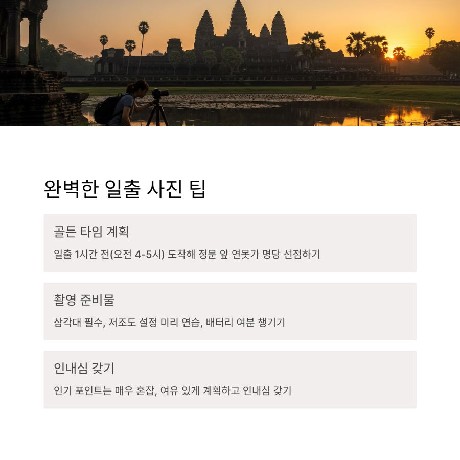 완벽한 앙코르와트 일출투어를 위한 체크리스트를 준비했어요. 아래 항목들을 꼼꼼히 확인하면 실패 없는 여행이 될 거예요: