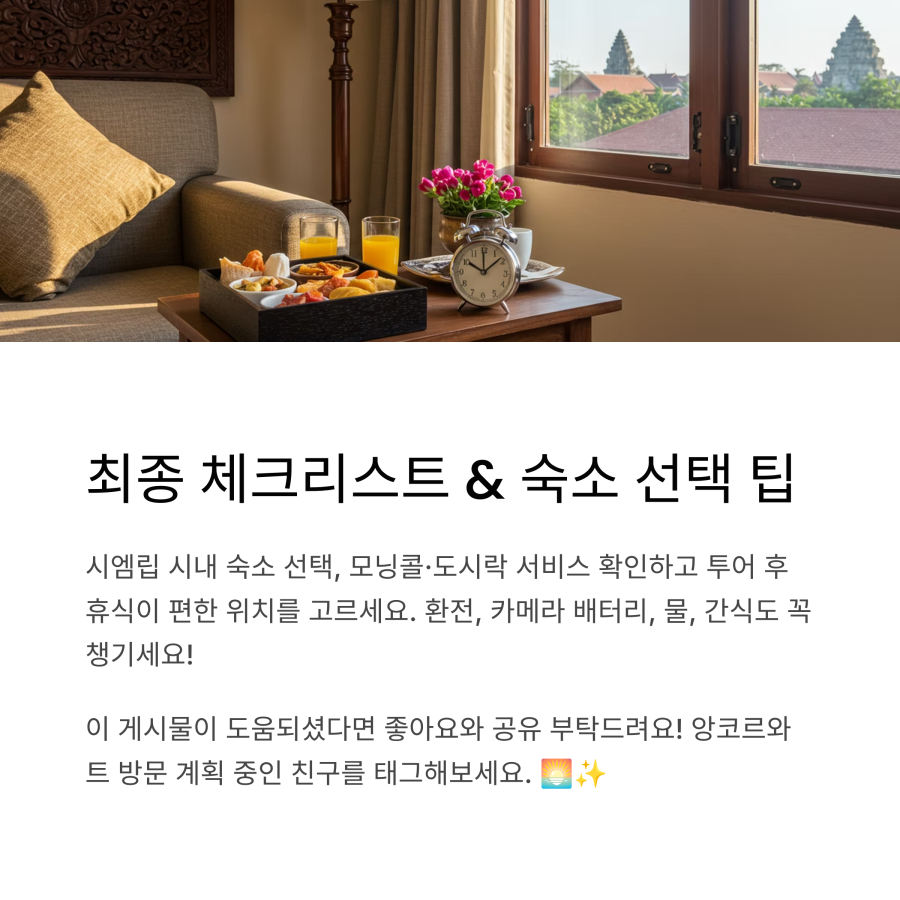 앙코르와트 일출투어를 위해서는 새벽에 일어나야 하므로 숙소 위치가 중요합니다. 시엠립 시내에서 앙코르와트까지 이동 시간이 약 15~20분 정도 소요되기 때문에, 너무 외곽에 위치한 숙소는 피하는 것이 좋아요.