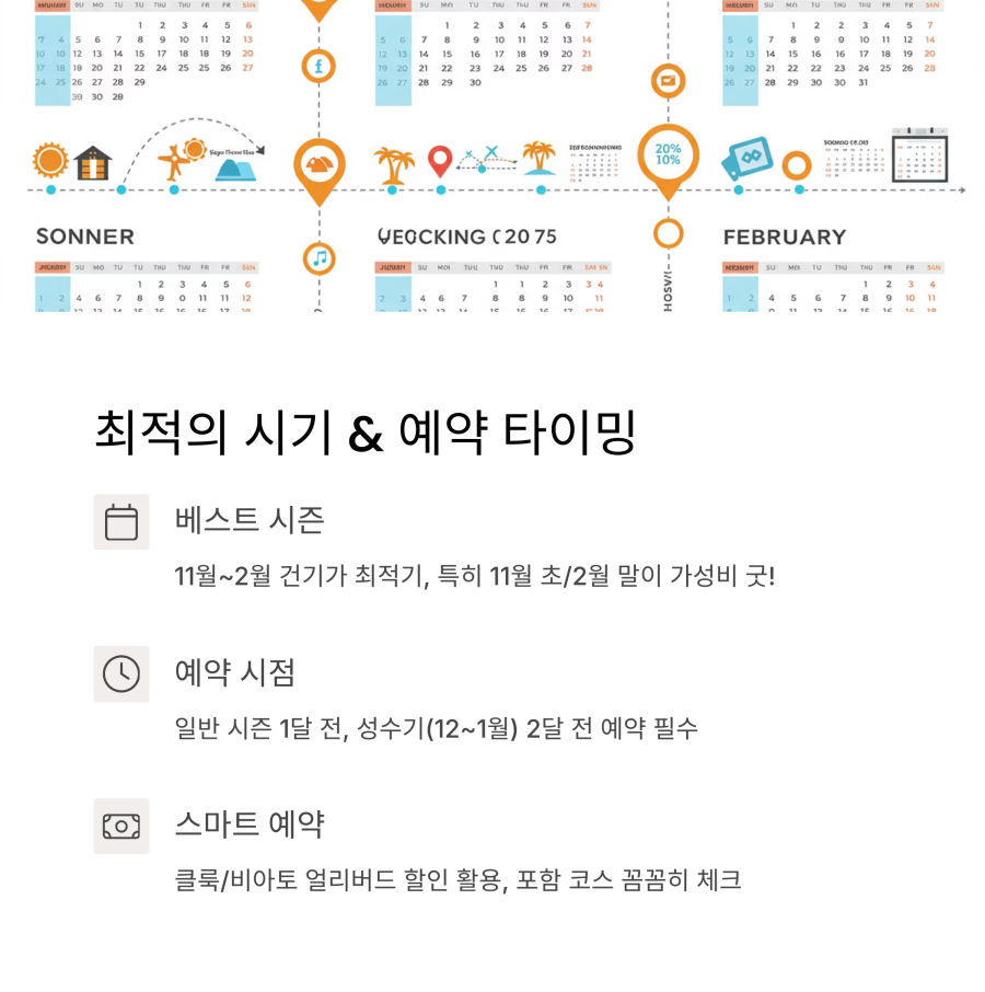 특히 12월과 1월은 날씨가 가장 쾌적하지만, 성수기라서 관광객이 많고 숙소와 투어 가격이 비싸다는 점을 염두에 두세요. 11월 초나 2월 말이 날씨와 혼잡도 면에서 균형 잡힌 선택일 수 있어요.