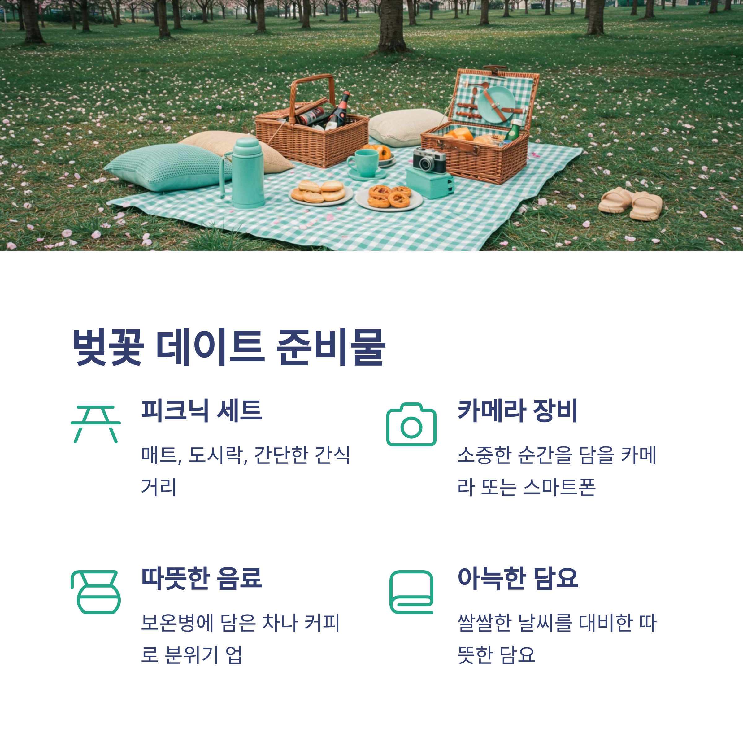 벚꽃 데이트를 더 특별하게 만들어줄 피크닉 세트를 준비해보는 건 어떨까요? 돗자리, 간단한 음료와 간식만 있어도 로맨틱한 시간을 보낼 수 있어요.