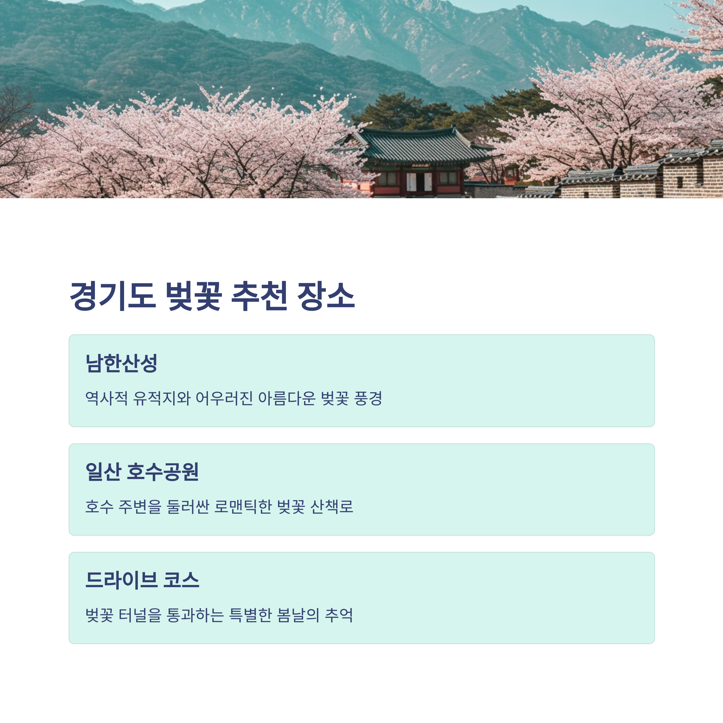 경기도에서는 남한산성의 벚꽃길이 특히 아름다워요. 역사적인 장소와 함께하는 벚꽃 감상은 색다른 매력이 있답니다.