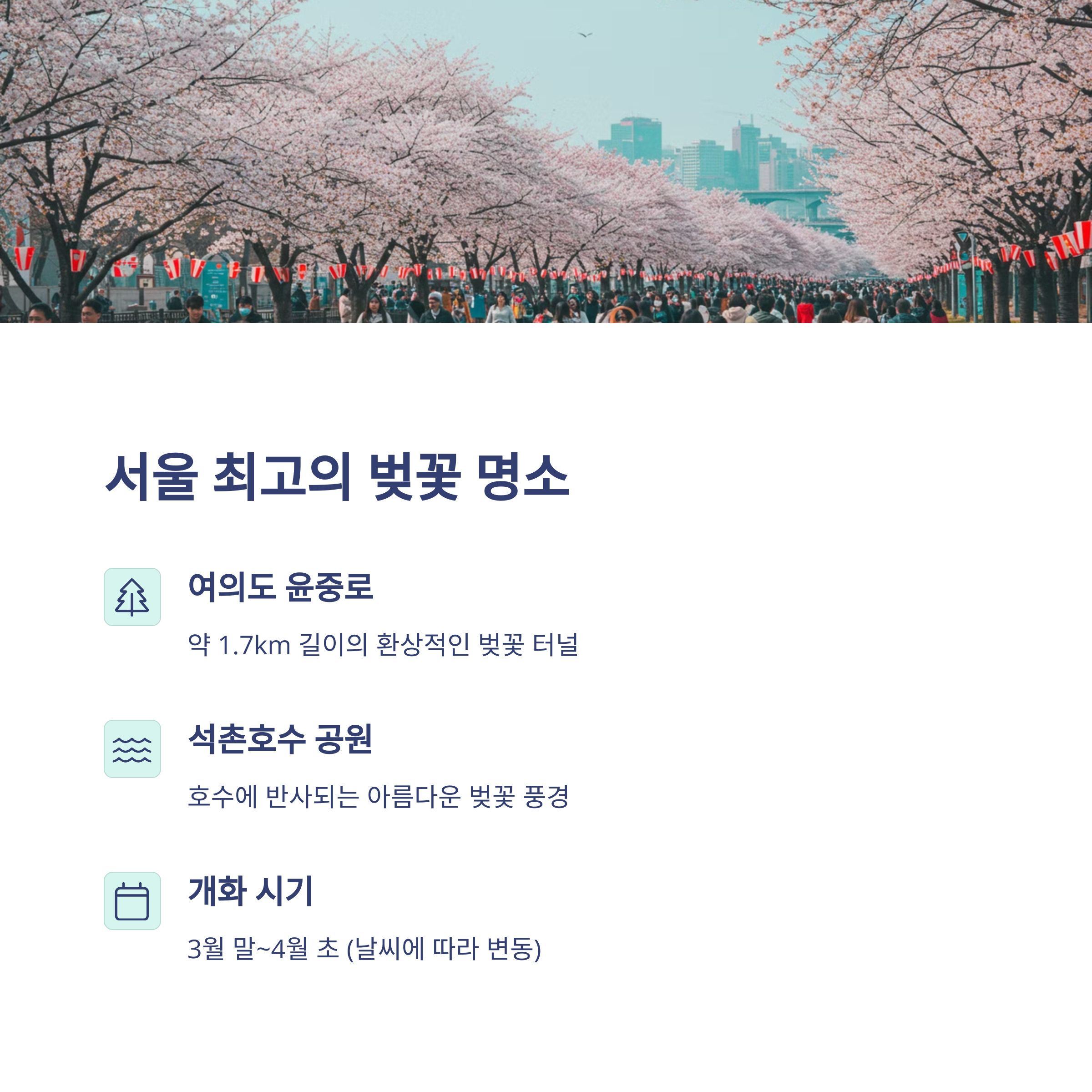 서울에서는 여의도 윤중로가 가장 유명한 벚꽃 명소예요. 약 1.7km에 달하는 벚꽃 터널은 매년 수많은 연인들의 데이트 코스로 사랑받고 있어요.