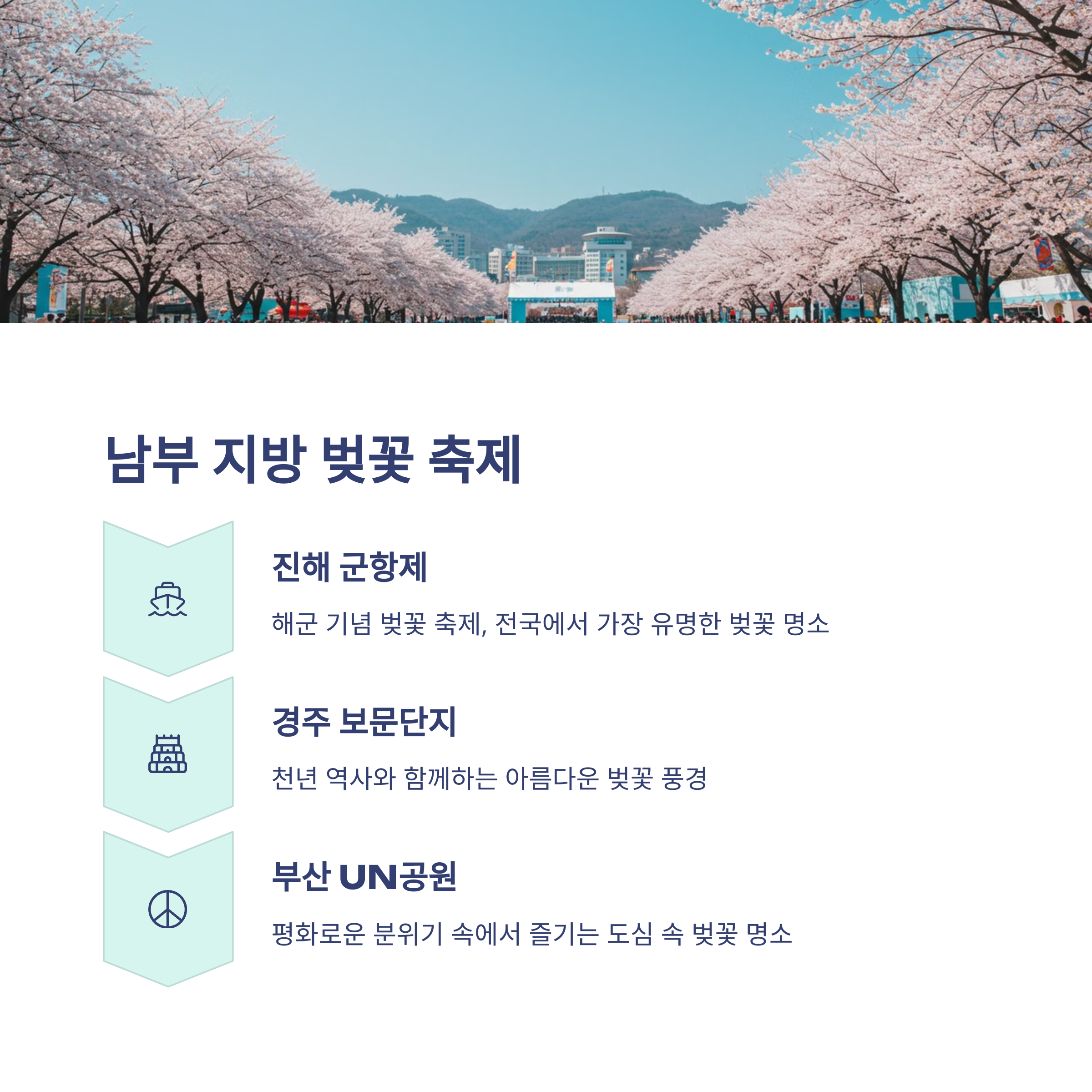 전국에서 가장 먼저 벚꽃이 피는 지역은 제주도와 남부지방이에요. 특히 진해 군항제는 대한민국 대표 벚꽃 축제로 꼽히죠.