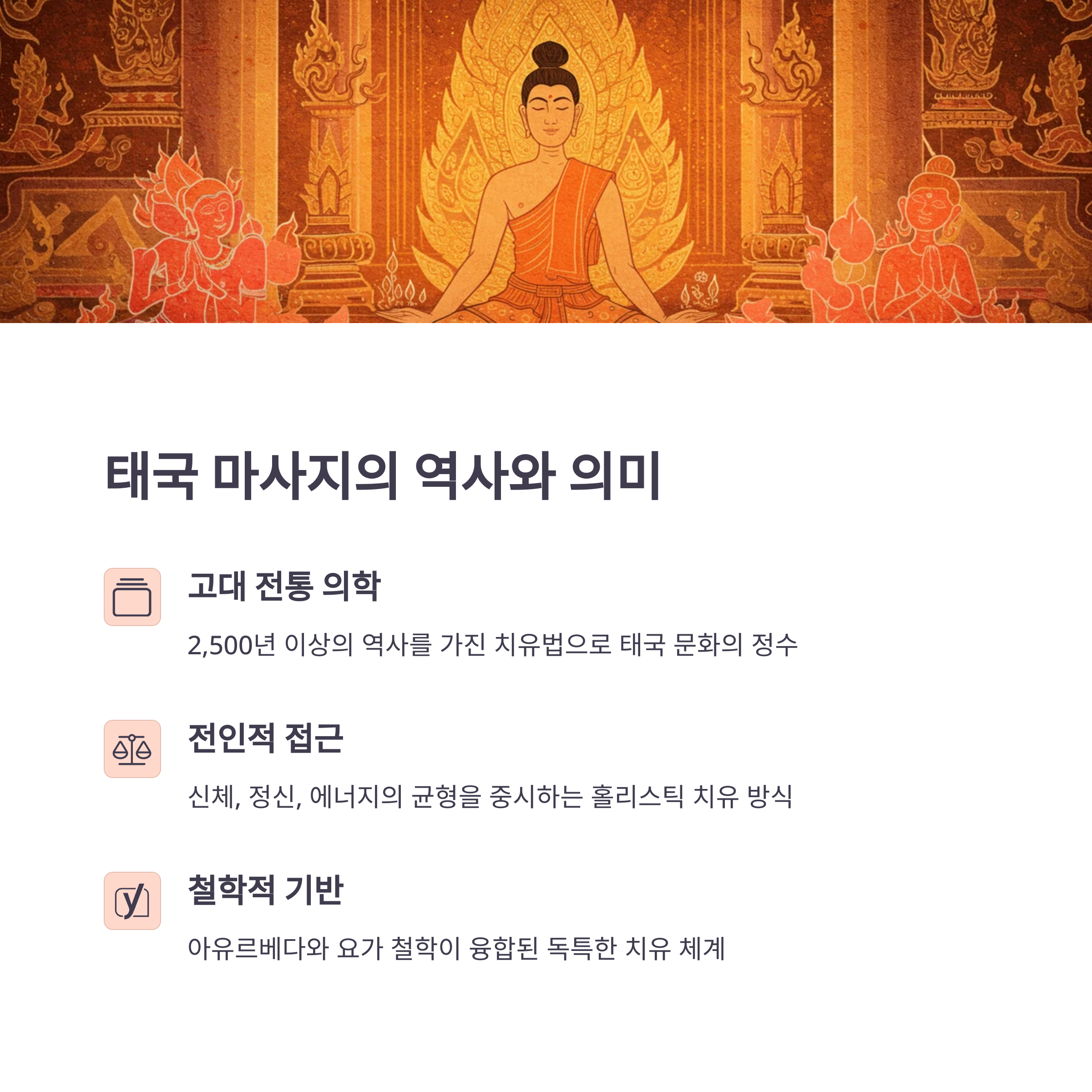 태국 마사지는 단순한 마사지가 아닌 태국의 전통 의학에 기반한 치유법이에요. 무려 2,500년이 넘는 역사를 가진 태국 마사지는 몸과 마음의 균형을 맞추는 데 중점을 두고 있답니다.