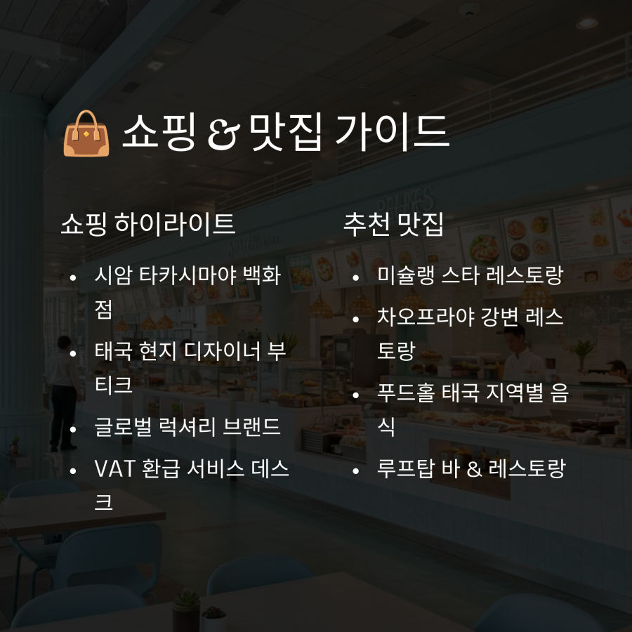 🔹 시암 타카시마야: 일본 프리미엄 백화점으로, VIP 쇼핑 경험이나 개인 쇼핑 도우미 서비스는 사전 예약이 필요합니다.